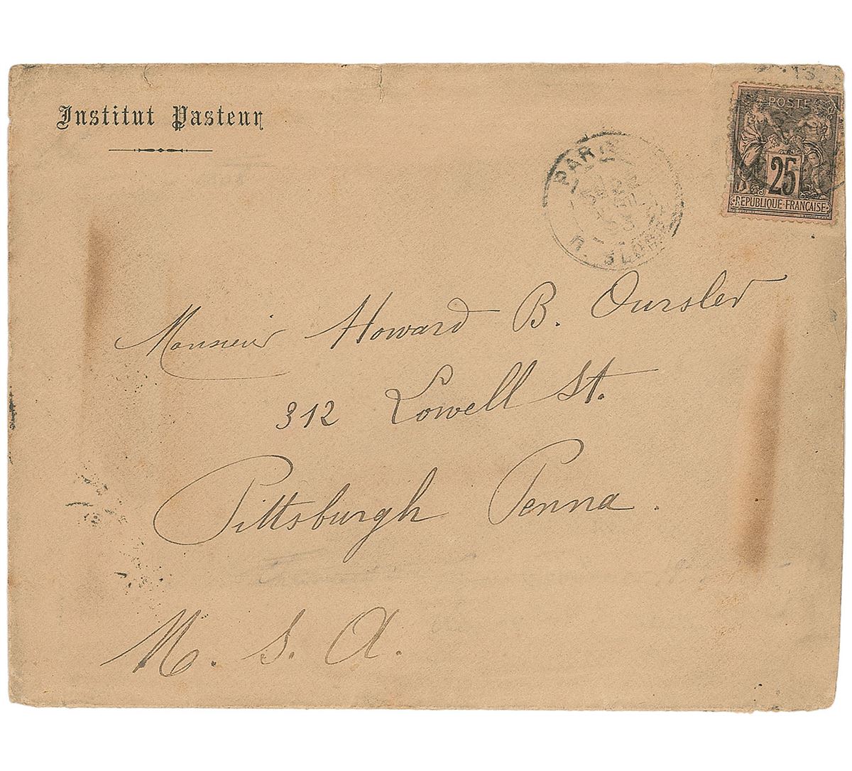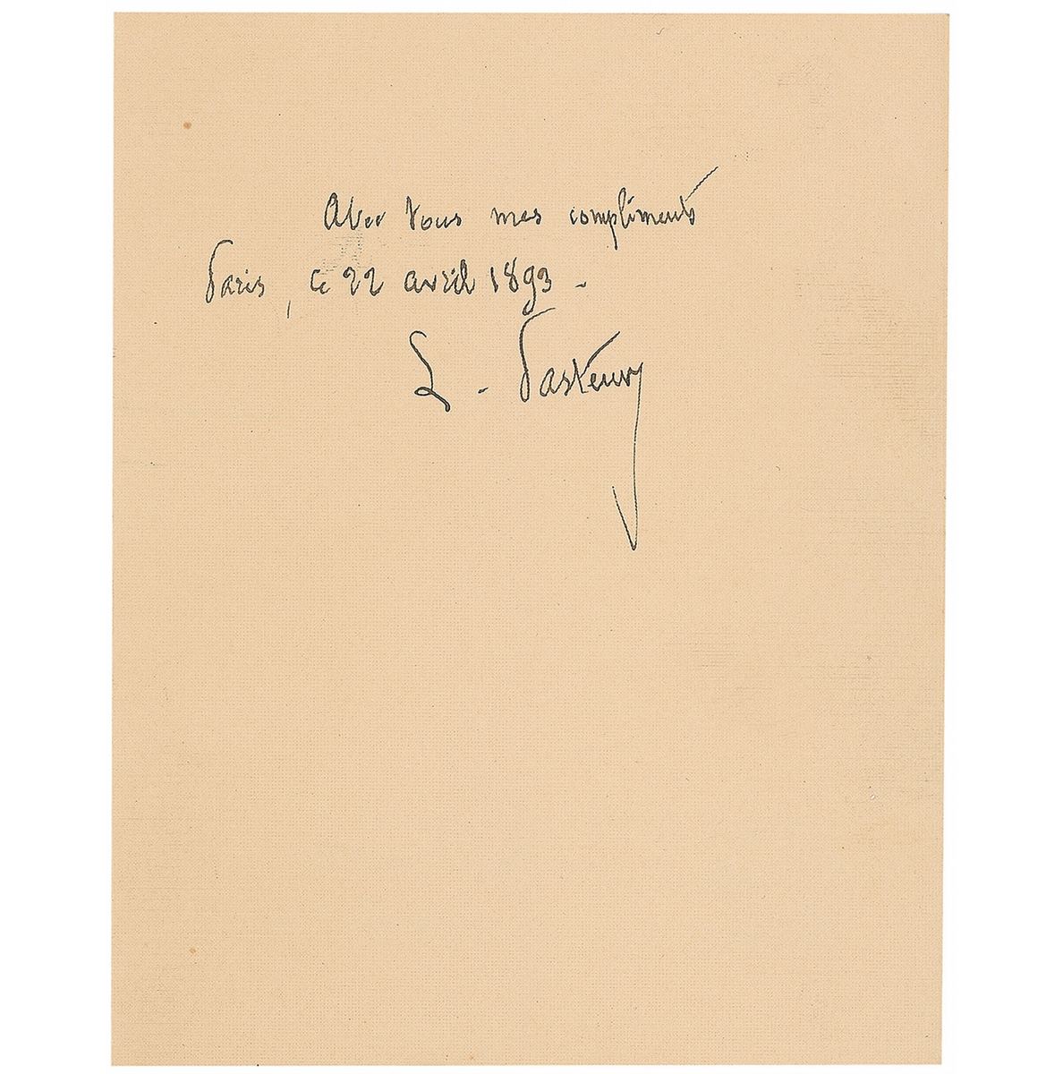 Ink signature in French (translated), “With my compliments, Paris, 22 April 1893, L. Pasteur,” on an off-white 4 x 5 sheet. In fine condition. Accompanied by the original mailing envelope.
