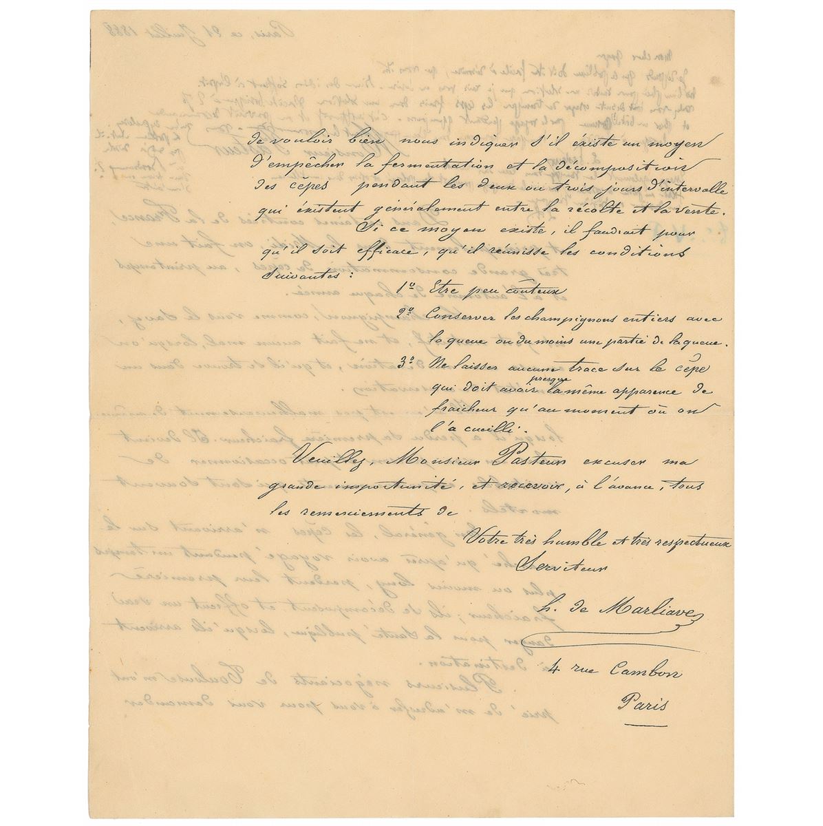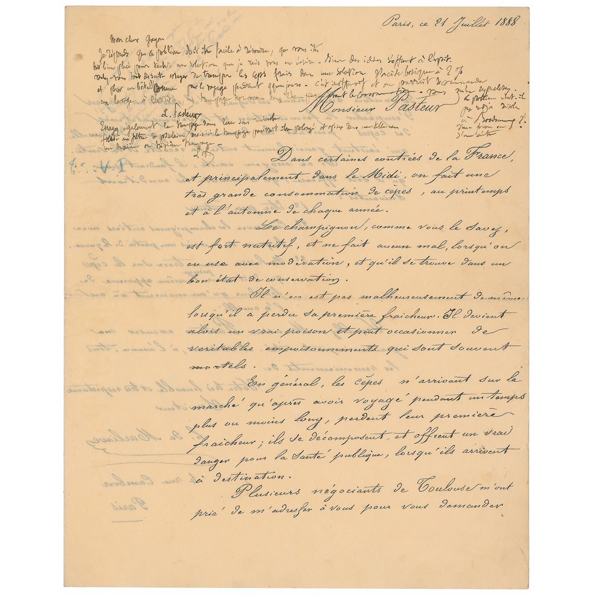 Autograph notes in French, signed three times, twice “L. Pasteur” and once “L. P.,” penned in the margins of a letter written to him by Henri de Marliave, one page both sides, 8.5 x 10.5, July 21, 1888. Marliave’s letter, in part (translated): "In some regions of France and mainly in the South, there is much mushroom consumption in the spring and fall of each year. The fungus, as you know, is very nutritious, and does no harm when used in moderation…It is not, unfortunately, once it loses its first freshness. It becomes a real poison and can cause real poisonings that are often fatal. In general, the mushrooms entering the market after traveling for a longer or shorter time are losing their first freshness; they decompose and provide a real danger to public health when they reach their destination. Several merchants of Toulouse have asked me to speak to you to ask if you would inform us if there is a way to prevent fermentation and decomposition of mushrooms for the two or three days that generally exist between harvest and sale. If the means exist, to be effective it must meet the following conditions: 1. Being inexpensive 2. Keep whole mushrooms with the stem or at least a part of the stem 3. Leave no traces on mushroom which must appear almost as fresh as when it was picked.” Pasteur’s response, in part (translated): "I answer that the problem should be easy to solve, you are very well placed to attempt a solution…Many ideas come to mind. Would you try immediately dipping fresh mushrooms in a 2% boric acid solution and placing them in a box during the trip…This is harmless and another washing could be recommended upon arrival and then a new soaking in water before consumption.” In fine condition, with central vertical and horizontal folds and show-through from writing to opposing sides. Pasteur’s most famous experiments involved the fermentation of yeasts, which, like mushrooms, are classified in the kingdom Fungi. He was also an advocate for the use of boric acid as an antiseptic and treatment for infections. Combining his knowledge in both of these fields, he was able to recommend a solution to this potentially deadly issue of mushroom toxicity.