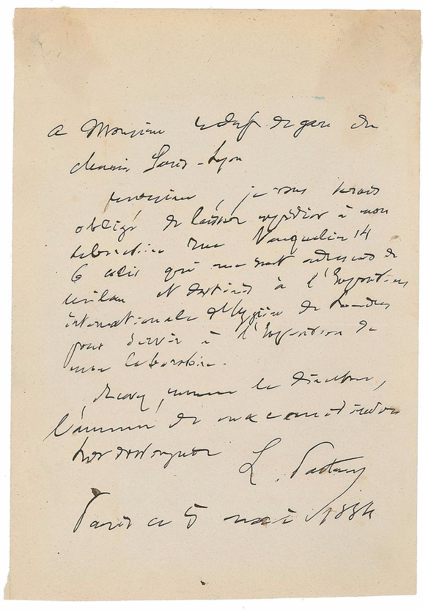 ALS in French, signed “L. Pasteur,” one page, 5.25 x 7.75, May 5, 1884. Letter to the stationmaster of the Paris-Lyon Railroad Line. In part (translated): "I should be obliged to you if you would permit the shipment to my laboratory Rue Vauquelin 14 of six parcels which are addressed to me from Milan and are destined for the International Health Fair in London. These are to be used as exhibits for my laboratory.” Show-through from mounting remnants to reverse, otherwise fine condition. During this period Pasteur was making great progress in the study of rabies, and had recently installed kennels for ‘mad dogs’ at his Rue Vauquelin laboratory. A detailed piece on Pasteur’s rabies studies and extensive laboratory appeared as a Scientific American Supplement cover story a month after he wrote this letter. Among the medical apparatus he exhibited in London were the hypodermic needles he used for his rabies experiments. Interesting scientific content that demonstrates Pasteur’s widespread international recognition at this point in his influential career.