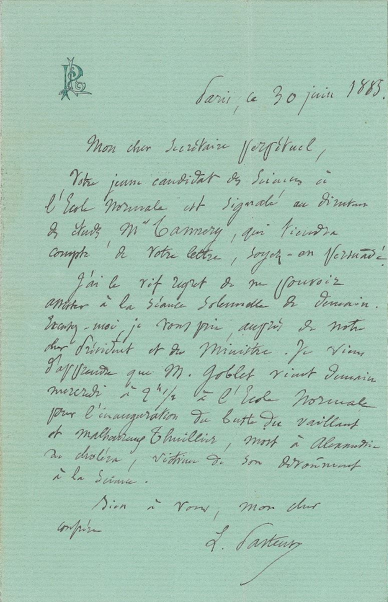 ALS in French, signed “L. Pasteur,” one page, 5.25 x 8, personal monogrammed letterhead, June 30, 1885. Letter to his secretary. In full (translated): "Your young candidate in the Sciences at the Ecole Normale has been pointed out to the Director of Studies McCannery…I profoundly regret not being able to be present at tomorrow’s solemn meeting. I ask you to present my excuses to our dear President and the Minister. I have just learned that Mr. Goblet is coming to the Ecole Normale tomorrow…for the unveiling of the bust of the valiant and unfortunate Thuillier, who died of cholera in Alexandria, a victim of his devotion to science.” In fine condition. Accompanied by a handsome engraved portrait of Pasteur in his lab. Louis Thuillier was a biologist who worked as an assistant in Pasteur’s lab and was instrumental in developing vaccines for rabies, swine fever, and anthrax. He had gone to Alexandria in 1883 to study an epidemic of cholera, during which time he contracted the disease and passed away.