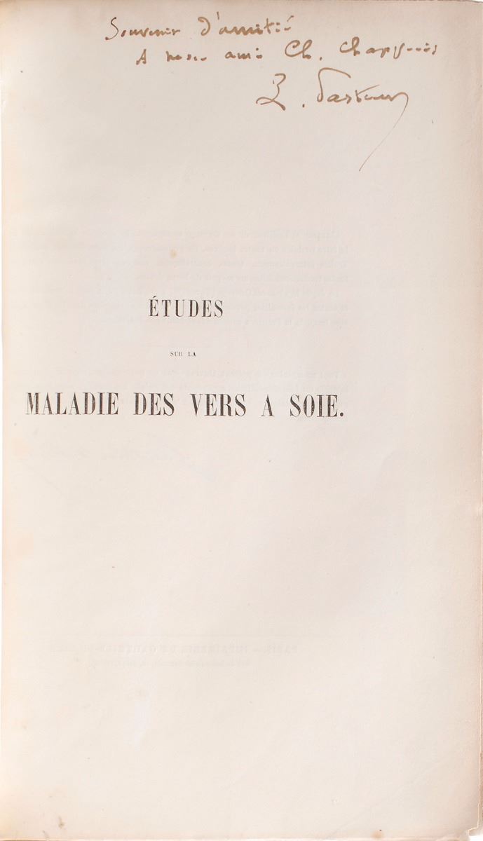 Signed book: Etudes sur les Maladies des Vers a Soie [Studies on Diseases of Silk Worms]. Paris: Gauthier-Villars, 1870. Softcover, 6.25 x 9.5, 322 pages. Signed and inscribed on the half-title page to his lifelong friend and confidant Charles Chappuis in ink, “Souvenir d’amitie a mon ami Ch. Chappuis, L. Pasteur.” Includes the second volume (signed on the cover by Chappuis) and a custom-made slipcase. Autographic condition: fine. Book is in good condition, with restorations and reinforcements to covers and binding; bookplate of Lucius Wilmerding affixed inside. Pasteur’s work concerns his studies of silkworm disease and practical methods of combating and preventing it. An important topic in Pasteur’s career—encouraged by his patroness, Empress Eugenie—his research with the silkworms helped shape his future concepts on the influence of environment on contagion, leading to his most significant contributions in the study of causes and prevention of disease.