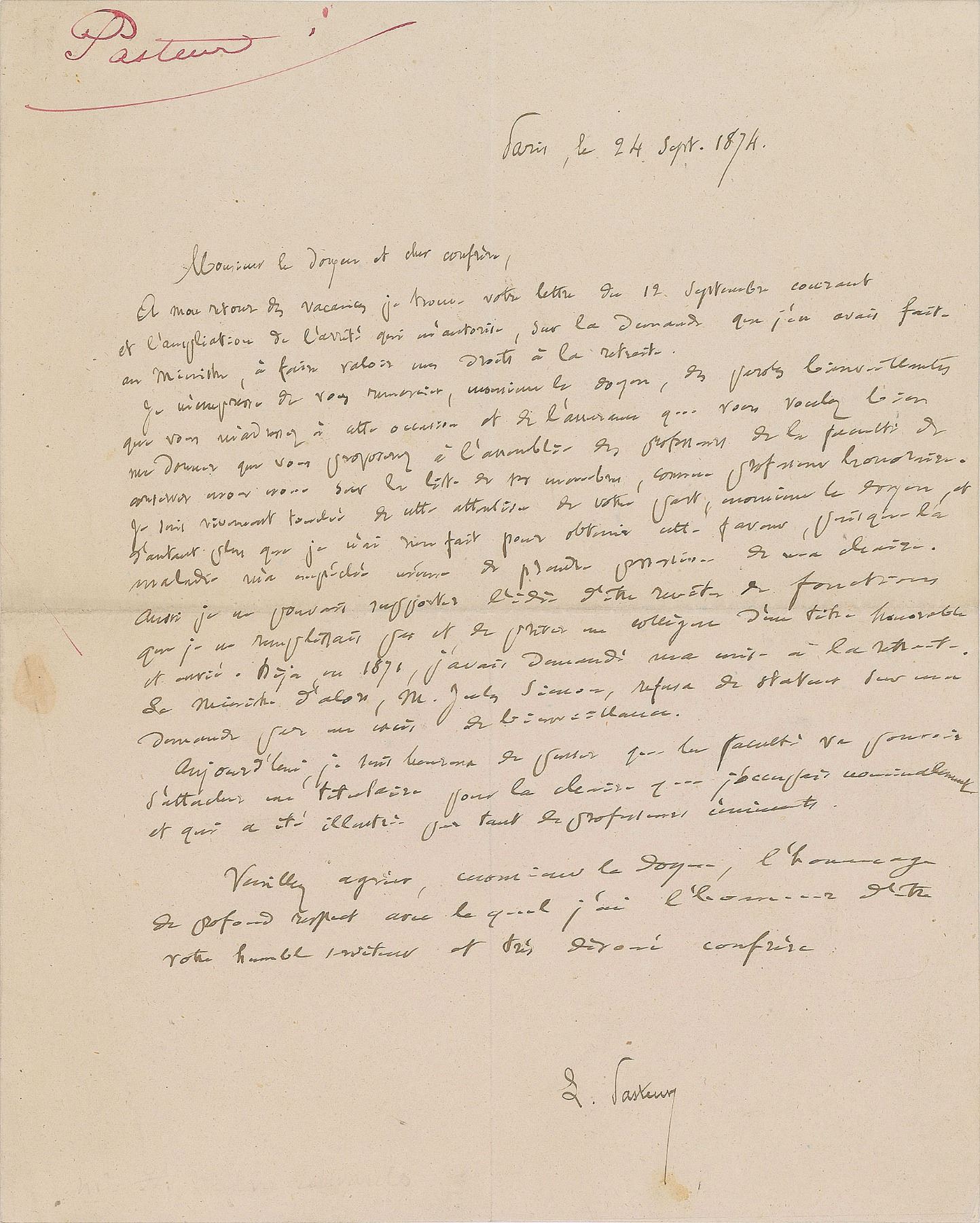 ALS in French, signed “L. Pasteur,” one page, 7.75 x 9.75, September 24, 1874. Letter to an unidentified dean and colleague, in full (translated): "On returning from vacation I find your letter of 12 September of the current year and the copy of the decision authorizing me, in response to the request I had made to the Minister, to claim my right to retirement. I hasten to thank you for the kind words you addressed to me on this occasion and for the assurances that you so kindly give me that you will propose to the assembled professors of the faculty to preserve my name on the list of its members as an honorary professor. I am greatly touched by this attention on your part and that much more as I have done nothing to merit this favor, since illness has prevented me from even occupying my chair. Also, I cannot support the idea of being relieved of functions which I didn’t fulfill and to deprive a colleague of an honorable and envied title. Already in 1871 I had requested being granted retirement. The Minister at the time, M. Jules Simon, refused to make a decision on my request from an excess of goodwill. Today I am happy to think that the faculty is going to be able to attach a titulary professorship to the chair which I occupied in name and which has been made famous by so many professors." In fine condition, with corner creasing and a few light stains.