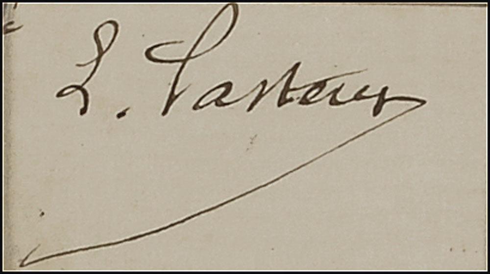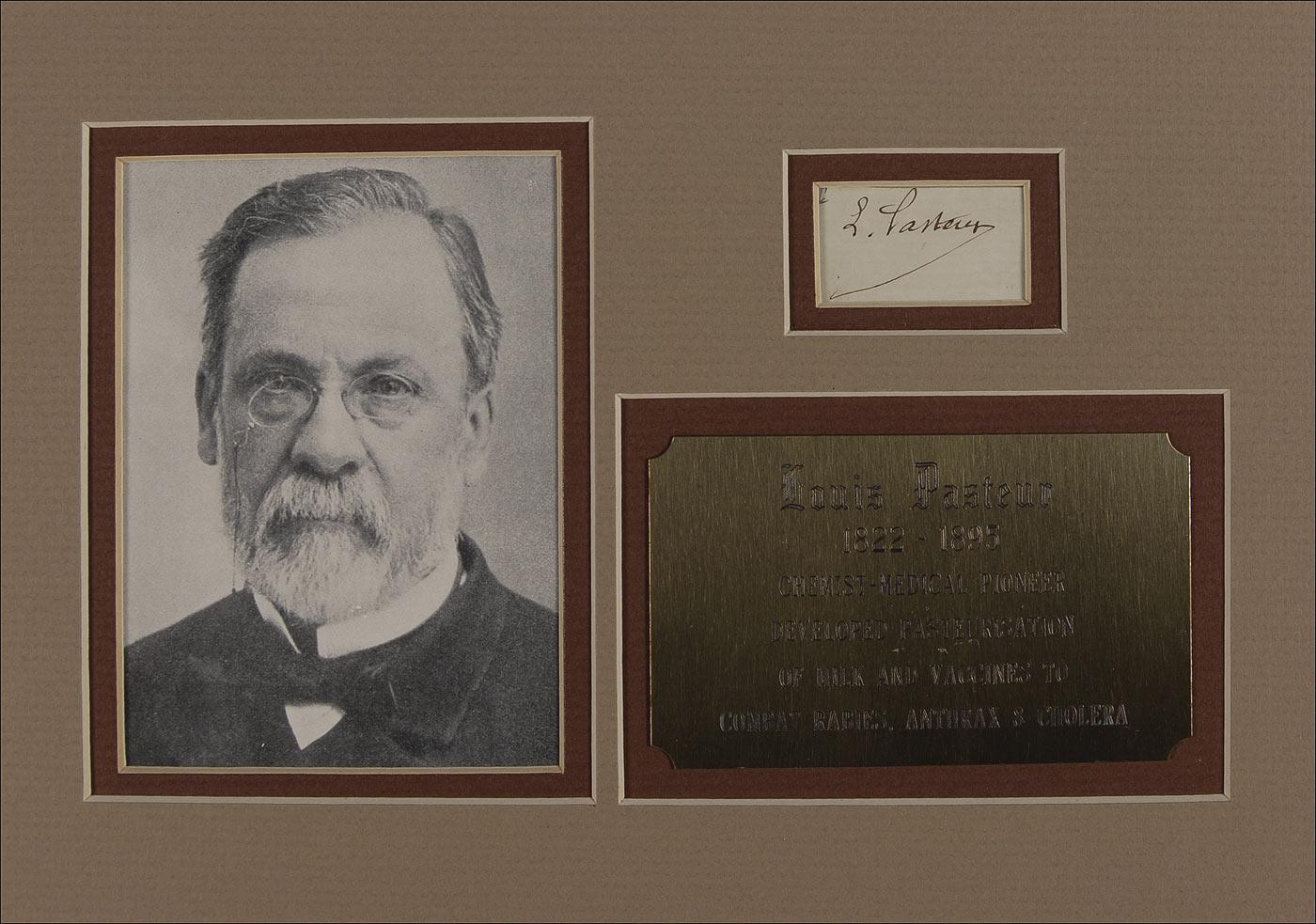 Vintage fountain pen signature, “L. Pasteur,” on a white 2.25 x 1.25 slip clipped from the close of a letter. Double matted with a book photo of Pasteur and an informational plaque, to an overall size of 10 x 7. In fine condition. Pre-certified PSA/DNA and RRAuction COA.