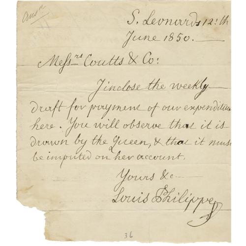 <B>Louis Philippe Autograph Note Signed</B></I> "<I>Louis Philippe</B></I>" in exile. One page, 4.75" x 5.25", dated June 12, 1850, S. Leonards. The note is addressed to the banking firm of Coutts & Co, "<I>I inclose sic the weekly draft for payment of our expenditure here. You will observe that it is drawn by the Queen, & that it must be imputed sic on her account.</B></I>" A very good note with a small tear at the left bottom corner. Louis-Philippe (1773 - 1850) was king of the French from 1830 to 1848 in what was known as the July Monarchy. He was the last king to rule France. He was known as Philippe Égalité for his liberal leanings. In his first exile (1793-1815) after the first French Revolution, Louis-Philippe visited the United States for four years, staying in Philadelphia, New York City, and Boston, where he taught French for a time and lived in lodgings over what is now the Union Oyster House, Boston's oldest restaurant. After the abdication of Napoleon and the restoration of the monarchy under his cousin King Louis XVIII, Louis-Philippe returned to live in France, claiming sympathy with the citizens of the country. He openly sided with the liberal opposition under Louis XVIII and then even more so under the reign of Louis's brother, King Charles X. In 1830, the July Revolution overthrew the régime of Charles X. The Chamber of Deputies proclaimed Louis-Philippe, who for eleven days had been acting as regent, as the new French king. The new monarch took the style of "King of the French," a constitutional innovation known as popular monarchy which linked the monarch's title to a <I>people,</B></I> not to a <I>state.</B></I> Louis-Philippe repudiated the legitimist theory of the divine right of kings. He ruled in an unpretentious fashion, avoiding the pomp and lavish spending of his predecessors. Despite this outward appearance of simplicity, his support came from the wealthy middle classes. At first, he was much loved and called the "Citizen King" and the "bourgeois monarch," but his popularity suffered as his government was perceived as increasingly conservative and monarchical. An economic crisis in 1847 led to the citizens of France revolting against their king again. He disguised himself and fled Paris. Riding in an ordinary cab under the name of "Mr. Smith," he escaped to England. There he lived in exile until his death on August 26,1850, only 82 days after he wrote this note.<BR><BR><b>Shipping:</b> Flat Material, Small (<a target="_blank" href="http://www.heritageauctions.com/common/shipping.php">view shipping information</a>)