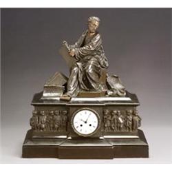 Having a two train movement striking on a bell within a slate case flanked by bronze relief friezes of children surmounted by a bronze classical male figure with books. Dial inscribed DENIERE/FT DE BRONZES/A PARIS. Movement signed DENIERE/A PARIS, CAILLEAUX and with Pons Medaille d'Or medallion and with impressed numeral. Lacking back plate of case.