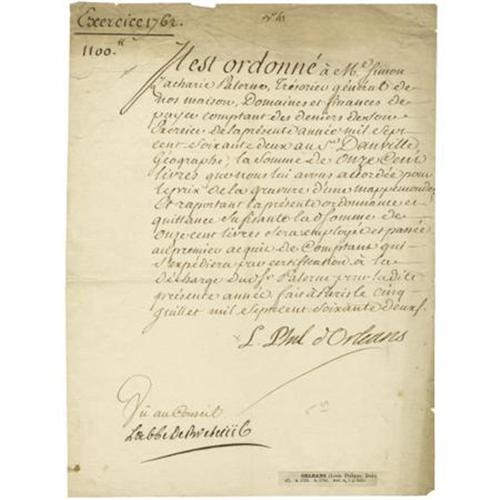 <B>Louis Philippe I, Duke of Orleans Manuscript Document Signed</B></I> "<I>L Phil D'Orleans</B></I>". One page, 9.5" x 12.5", in French, n.p., 1762. Louis Philippe (1725-1785) was born at Versailles, the son of Louis, duc d'Orleans. He was known as the duc de Chartres until his father's death in 1752. Serving with the French armies in the War of Austrian Succession, he distinguished himself in the campaigns of 1742, 1743, and 1744, and at the battle of Fontenoy in 1745, retiring to Bagnolet in 1757, and occupying his time with theatrical performances and the society of men of letters. Folds, light staining at top, else near fine with a bold signature.<BR><BR><b>Shipping:</b> Flat Material, Small (<a target="_blank" href="http://www.heritageauctions.com/common/shipping.php">view shipping information</a>)