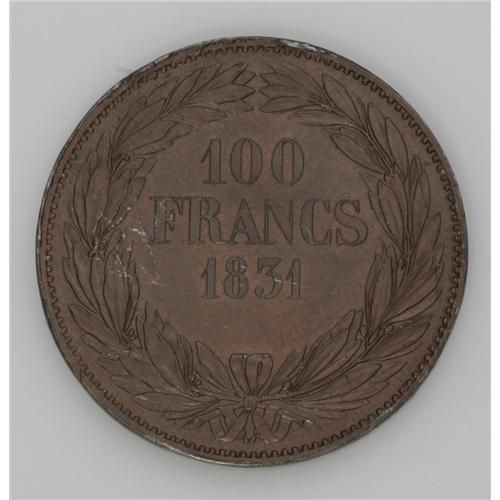 <B>Louis Philippe I - Pair of Copper Essais, </B></I>100 Francs 1831, two examples as follows: KM-PnB34, CENT Francs but smaller lettering than shown in KM and 100 Francs, not listed in the SCWC. Both coins are glossy brown AU.