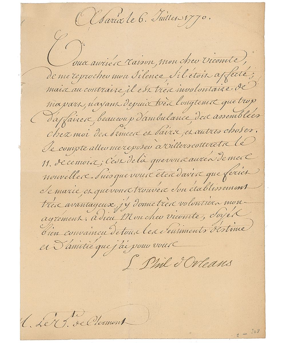 The father of future King of the French, Louis-Philippe, who actively supported the French Revolution but was guillotined during the Reign of Terror (1747–1793). LS in French, signed “L. Phil. d’Orleans,” one page, 6.25 x 8.75, July 6, 1770. To a Viscount, on his various activities. In fine condition, with a few unobtrusive creases.