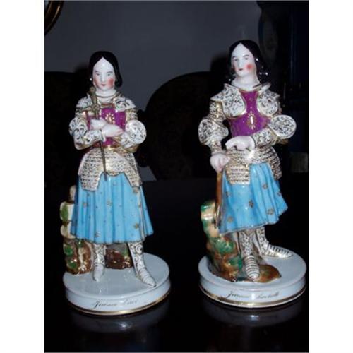 Fine pair of Louis Philippe Old Paris porcelain Liquer bottles in the manner of Jacob Petit.Thy are modeled as Joan of Ark & Joan Hachette both famous French heroines in Medieval France that were military leaders in wars against foreign oppressors.Joan of Ark has a bronze sword that comes out of her hand.Joan Hachette has a ax.The figures have raised gold gilt.There names in French in gold are Jeanne D'Arc & Jeanne Hachette on the base.The heads come off to put liquer inside.Thy are both 11" 1/2 tall.Thy both have small rim chips to the body were the heads come off.