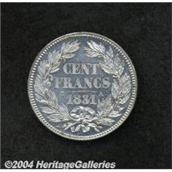 <B>Louis Philippe Pewter Pattern 100 Francs 1831-A, </B></I>Mazard 1054, "Cent Francs." Design by Barre. UNC, very light oxidation on the obverse only. <BR><BR><B>Important notice:</B> Heritage usually auctions material at the rate of 200-250 lots per hour. On some occasions eBay Live bid software or the Internet may not be able to keep up with the pace of the auction. We recommend placing a realistic absentee bid now as insurance to avoid disappointment. Occasionally the auctioneer may eliminate or reject an eBay Live bid, and the auctioneer may also reopen a lot after the close of the eBay live bidding (usually because we missed an audience bid), and may reject your bid even if it shows you as the winning bidder. By bidding via eBay Live, you agree that Heritage may award the lot to another bidder at its sole discretion under the circumstances described above or any other reasonable circumstances. Since eBay bids are not shown to us until we open the lot on the floor, we treat those bids just like floor bids. In most cases the floor responds before the eBay bid is presented to us, due to Internet lag time, so for consistency we have made it a policy that floor bids are always considered first over tie eBay live bids. Also please note that all Heritage lots purchased through eBay Live carry a 20% Buyer's Premium. Please make sure you read the Terms and Conditions before you bid.