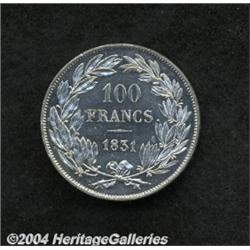 <B>Louis Philippe Pewter Pattern 100 Francs 1831, </B></I>Mazard 1060, "100 Francs," design by Leclerc. Prooflike BU. <BR><BR><B>Important notice:</B> Heritage usually auctions material at the rate of 200-250 lots per hour. On some occasions eBay Live bid software or the Internet may not be able to keep up with the pace of the auction. We recommend placing a realistic absentee bid now as insurance to avoid disappointment. Occasionally the auctioneer may eliminate or reject an eBay Live bid, and the auctioneer may also reopen a lot after the close of the eBay live bidding (usually because we missed an audience bid), and may reject your bid even if it shows you as the winning bidder. By bidding via eBay Live, you agree that Heritage may award the lot to another bidder at its sole discretion under the circumstances described above or any other reasonable circumstances. Since eBay bids are not shown to us until we open the lot on the floor, we treat those bids just like floor bids. In most cases the floor responds before the eBay bid is presented to us, due to Internet lag time, so for consistency we have made it a policy that floor bids are always considered first over tie eBay live bids. Also please note that all Heritage lots purchased through eBay Live carry a 20% Buyer's Premium. Please make sure you read the Terms and Conditions before you bid.