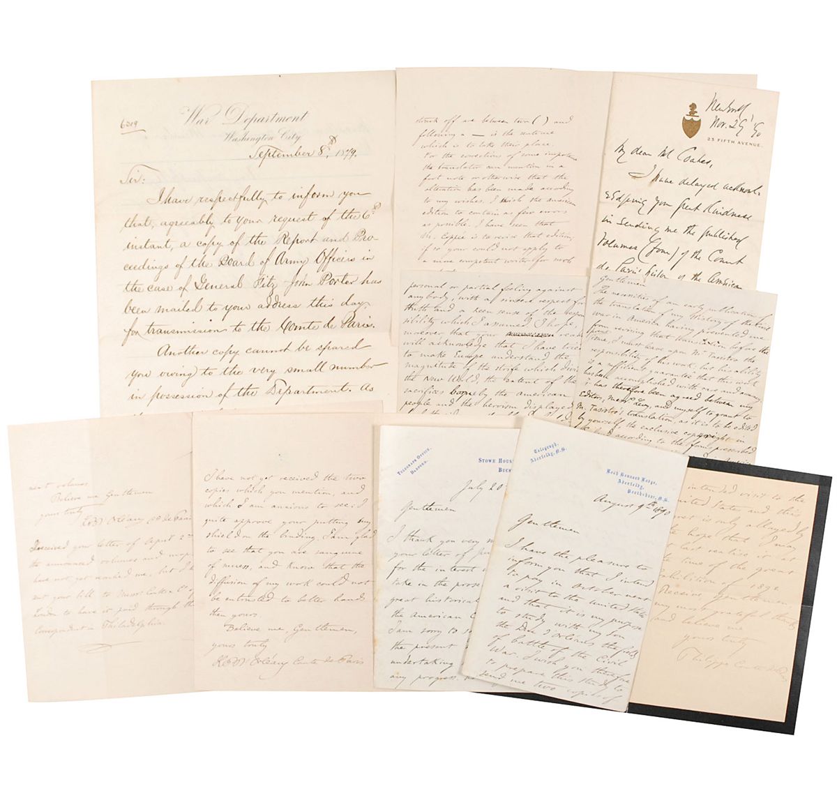 Union officer (1838–1894) on the staff of Major General McClellan, and a claimant to the French throne from 1848 until his death. Seven ALSs related to his History of the Civil War written to Philadelphia publisher Porter and Coates, totaling 17 pages, dated between June 1875 and July 1894. The first, dated June 1875, in part: “My History of the Civil War in America…has been written rather for the instruction of the European public than for transatlantic readers to whom every incident of the war is already familiar…I have tried to make Europe understand the magnitude of the strife which divided the New World, the extent of the sacrifices borne by the American people and the heroism displayed by both sides on the bloody fields of battle. I shall be proud…to perpetuate the memory of that heroism and the glory of the American soldier, without distinction between the blue and grey coats.” The second, dated November 1875, in part: “Since the two first volumes…have been published, several mistakes…have been pointed out to me. I have corrected these errors in my copy in view of a second edition.” The other letters continue to comment on research and revisions for future editions of the voluminous work. In overall fine condition. Accompanied by letters from G. W. McCrary and Daniel Sickles related to d’Orleans’s History. Additional excerpts are available online at rrauction.com. A fantastic assemblage of letters detailing the lengthy process of writing and editing the History of the Civil War in America, which today is considered a standard reference work.