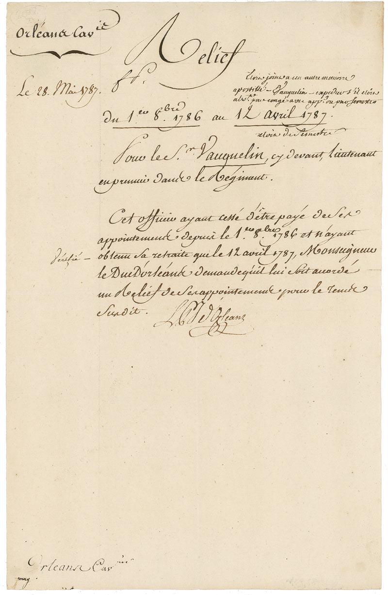 Member of a cadet branch of the House of Bourbon, the ruling dynasty of France. He actively supported the French Revolution and adopted the name Philippe Égalité, but was nonetheless guillotined during the Reign of Terror. Manuscript DS, in French, signed “LP d’Orleans,” one page, 8 x 12.25, May 28, 1787. Crisply penned untranslated document, signed at the conclusion by d’Orleans. Central horizontal and vertical fold, and a few light creases, otherwise fine condition.