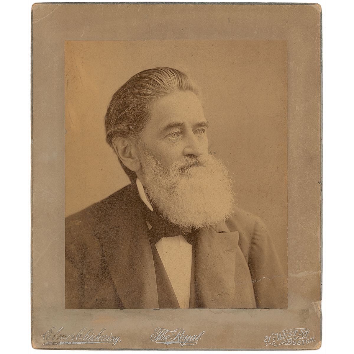 Boston-based printer, lithographer, and publisher (1824–1909) considered the ‘father of the American Christmas card.’ Uncommon matte-finish 7.5 x 9.25 portrait of Prang by Elmer Chickering of Boston, affixed to its original 10 x 12 photographer’s mount, signed and inscribed on the reverse in black ink, “To my dear dear daughter, Louis Prang, Nov. 12, 1895.” In very good condition, with overall creases (significant creases to lower portion), edge dings, and staining.