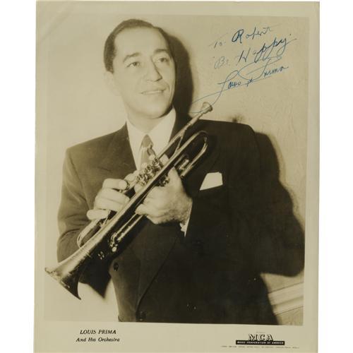 <B>Louis Prima Autographed Photo.</B></I> A b&w 8" x 10" photo inscribed and signed by Prima in blue ink, in Fine to Very Fine condition with moderate tanning and very mild creasing and wear to the edges and corners.<BR><BR><b>Shipping:</b> Flat Material, Small (<a target="_blank" href="http://www.heritageauctions.com/common/shipping.php">view shipping information</a>) <BR><BR><B>Important notice:<