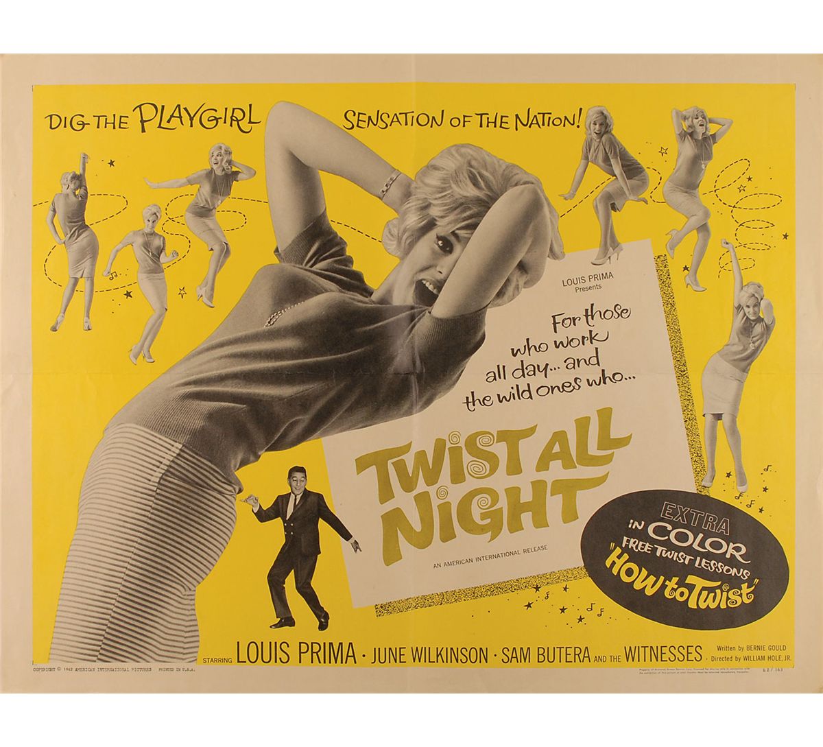Original color 28 x 22 half-sheet movie poster for the 1962 film Twist All Night, starring Prima and June Wilkinson. In fine condition, with expected central vertical and horizontal folds and trivial corner tip creases.