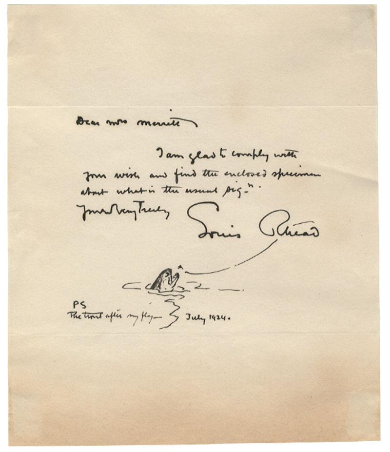Louis John Rhead (1857 - 1926). English-born American artist, illustrator, author and angler . ANS with sketch. July 1924. 5 1/2" x 6 3/8". "I am glad to comply with your wish and find the enclosed specimen about what is the usual sig'n., Yours very truly, Louis Rhead" Below a sketch of a fish at water's surface, Rhead writes; "PS The troug after my fly, July 1924".