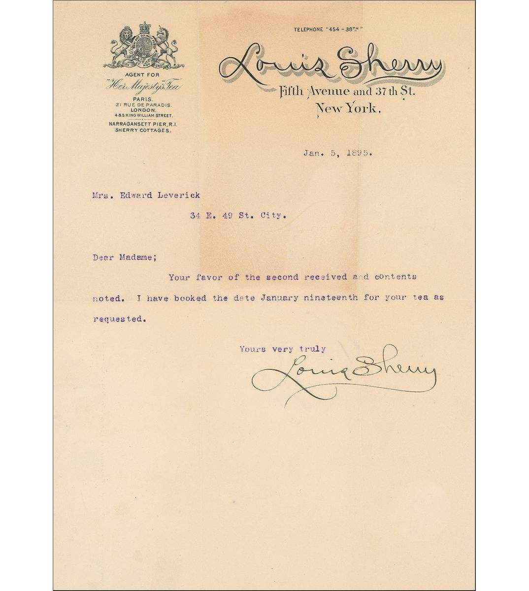 Restaurateur, caterer, confectioner and hotelier (1855–1926) during the Gilded Age and early 20th century. His name is typically associated with an upscale brand of candy and ice cream, TLS, one page, 7.75 x 11, personal letterhead, January 5, 1895. Brief letter to a woman. In full: “Your favor of the second received and contents noted. I have booked the date January nineteenth for your tea as requested.” In very good condition, with intersecting folds, one through a single letter of signature, a few creases and wrinkles, and a couple blocks of toning to upper half of letter.