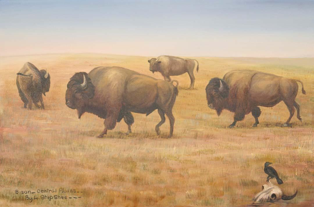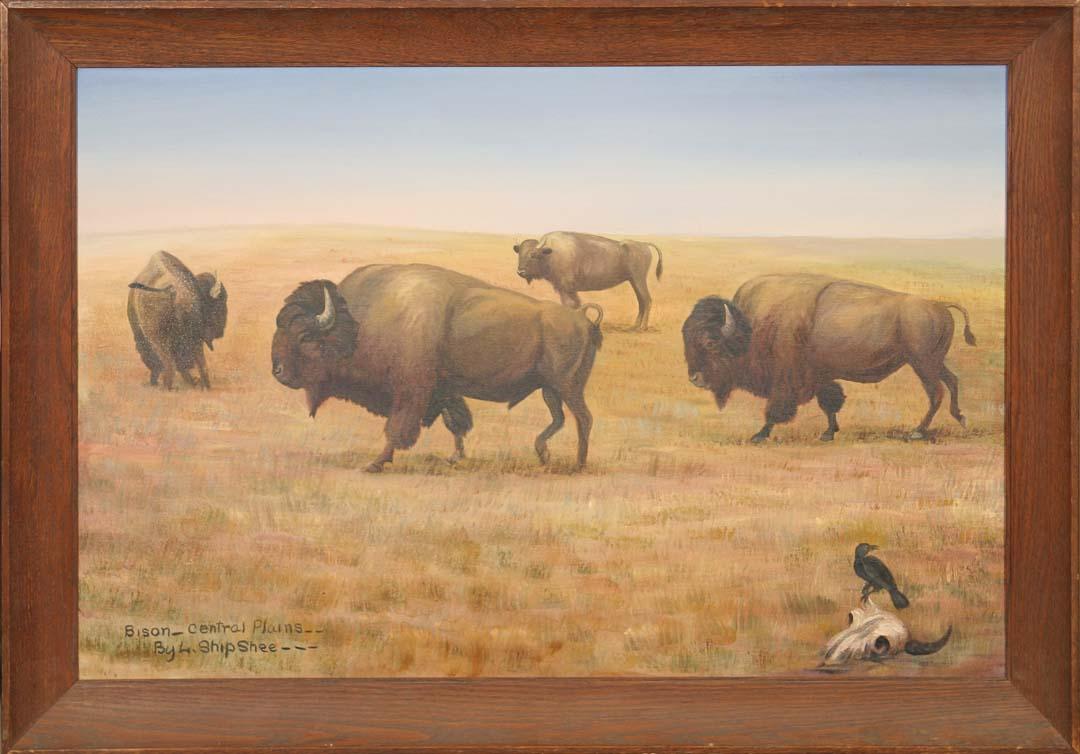 Louis Shipshee (1896-1975). Bison - Central Plains. 24" x 36" oil on canvas. Signed lower left. (est $2,000-3,000). For condition reports please visit: www.auctioninsantafe.com/cr2011.pdf