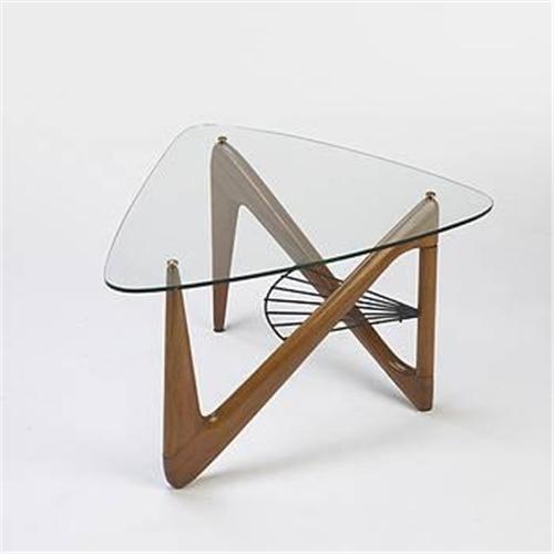Louis Sognot<BR>coffee table<BR>France, c. 1950<BR>oak, enameled metal, brass, glass<BR>35.5"w x 25.75"d x 17.5"h<BR><BR><BR><BR><BR><BR><BR>