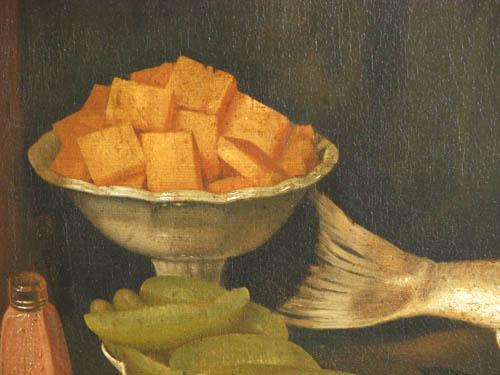 Description: an elaborate table laid with a whole fish, tomatoes, bread, onions, sweet potatoes or cut melons, pickles, salt and pepper shakers, and cutlery