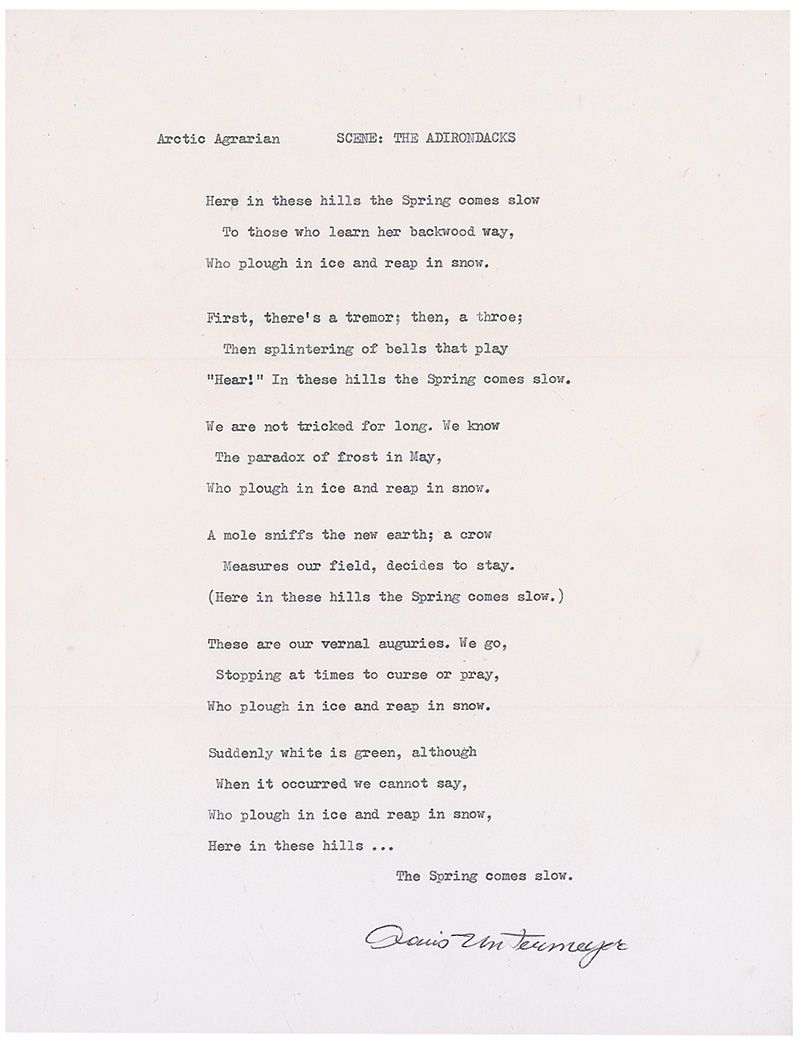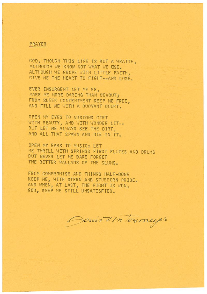 American author, poet, anthologist, and editor (1885–1977). Two items: TQS, one page, 8.5 x 11, of Untermeyer’s poem entitled ‘Arctic Agrarian.’ Poem begins: “Here in these hills the Spring comes slow; To those who learn her backwood way, Who plough in ice and reap in snow.” Signed at the conclusion in black ballpoint by Untermeyer; and a typed prayer on a yellow 6 x 8.5 card, also signed at the conclusion in black ballpoint. In fine condition, with trimmed bottom edge to prayer and intersecting folds to poem.