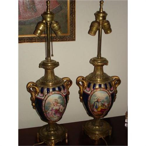 Pair of 19th C. Continental porcelain and ormolu mounted pedestalurns with splait handels, each decorated with hand paited enamel portait, onone of louis XV, the mate with a portait of marie Louise, circa 1900 fitted as table lamps,26" H to top of finials losses.