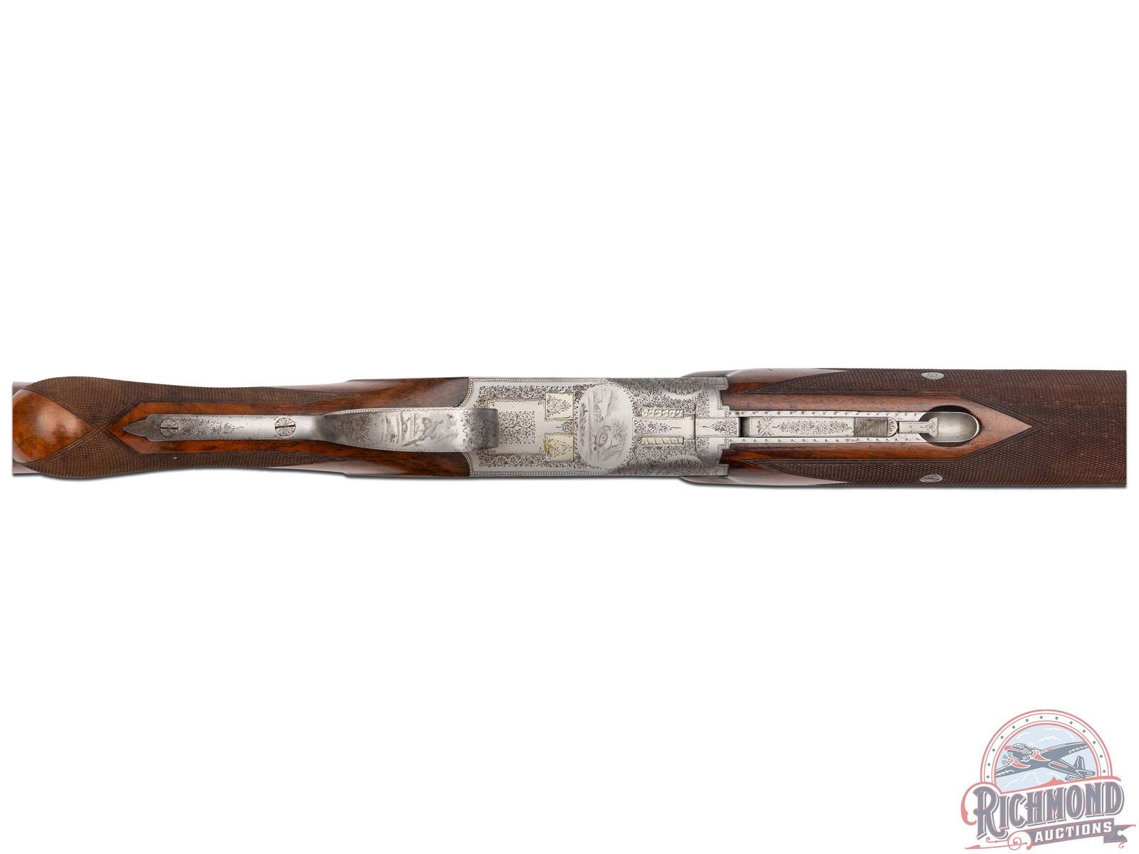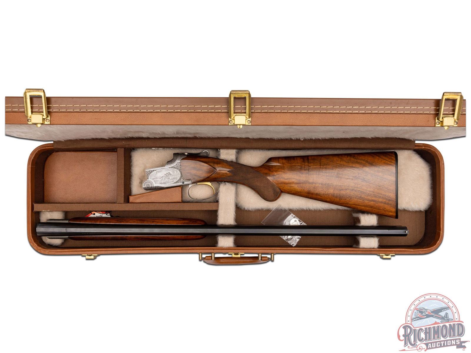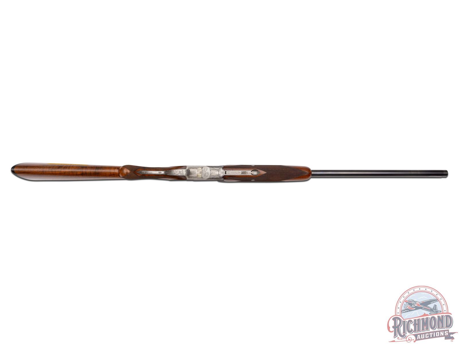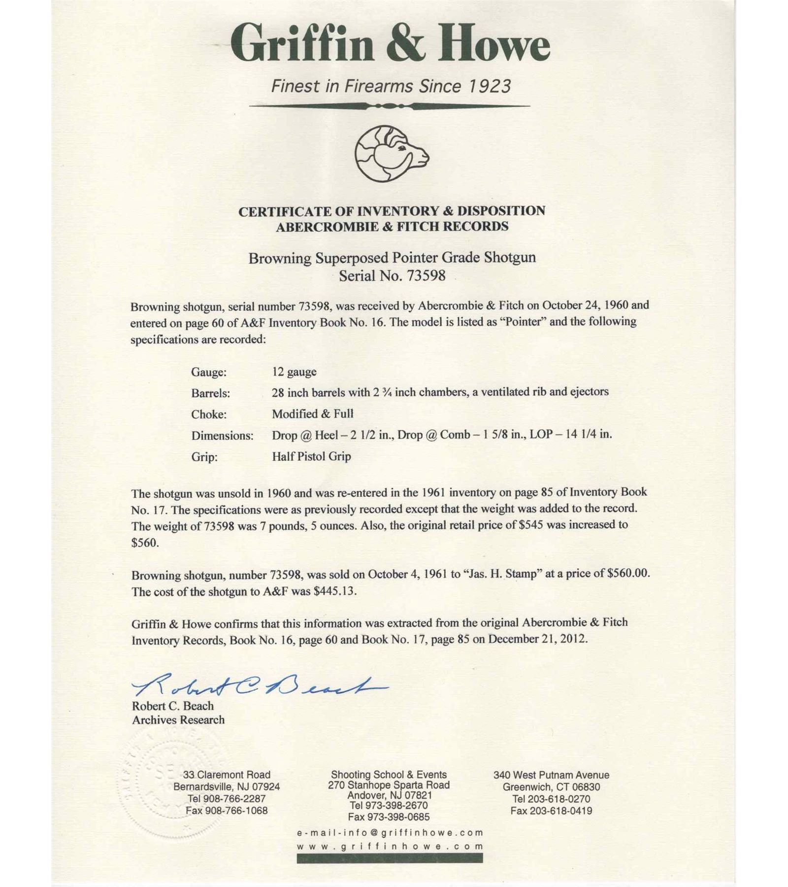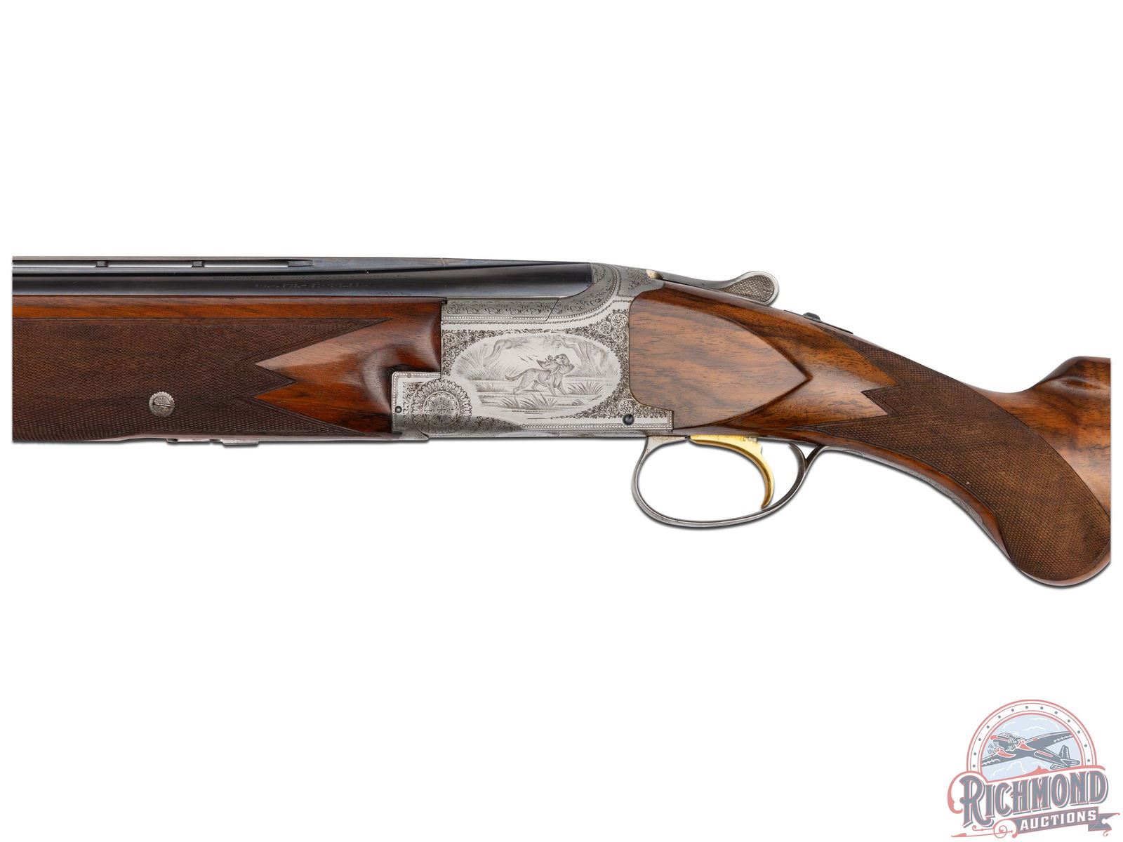 Made in Herstal, Belgium by Browning in 1960. Gun comes with Griffin and Howe Letter stating it was shipped to Abercrombie and Fitch on October 24, 1960 and sold to "Jas. H. Stamp" in 1961. Also comes with Browning Letter verifying all options and original price. This model was only built from 1960-1966. Fitted with 28" blued Special Steel barrels in 12 gauge with ventilated rib, ejectors, 2-3/4" chambers, Full and Modified chokes, with Browning St. Louis and Montreal address markings. Satin finish receiver with vignette background engraving and a pointer on right with pheasant in mouth and a setter scene on left with duck in mouth. Both panels signed "L. Vrancken". Bottom has vignette and quail scene. Design was originally designed by Felix Funken and executed by Louis Vrancken. Action has gold washed single selective trigger with top tang safety and barrel selector. Select checkered walnut long tang round knob pistol grip stock with "Browning" butt plate. Matching attached sporting forearm with latch release. Comes in Browning fitted luggage trunk case. LOP: 14-1/4". DAC: 1-5/8". DAH: 2-1/2". CALIBER: 12 GA. S/N: 73598. FFL STATUS: Curio & Relic.