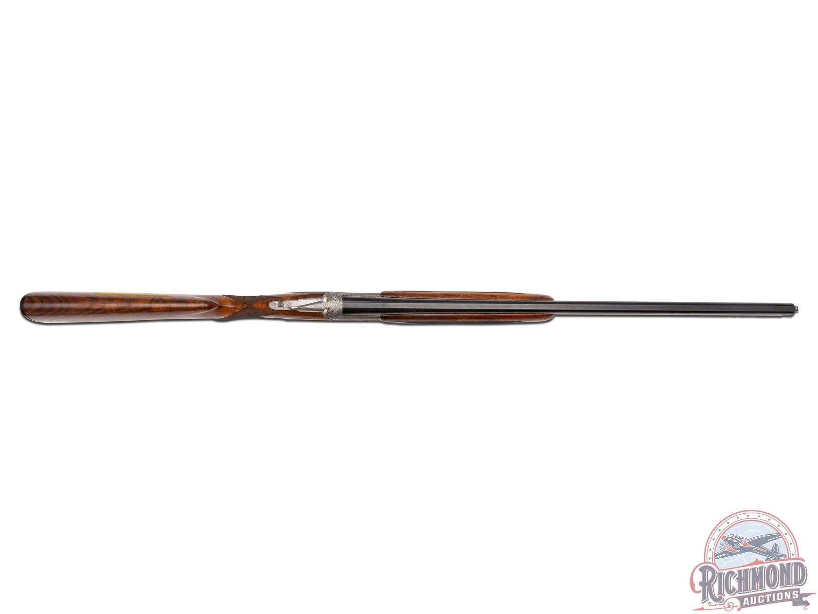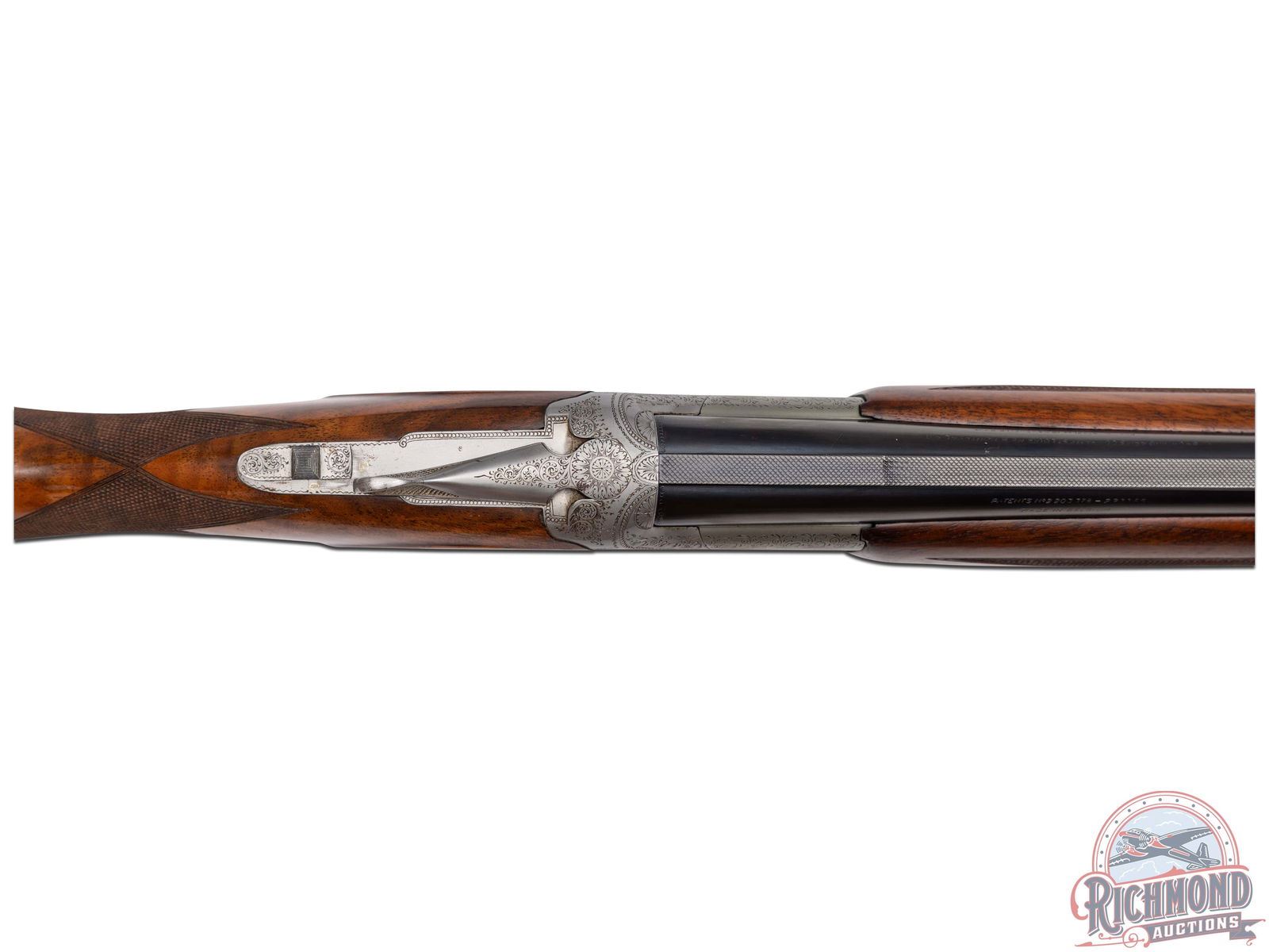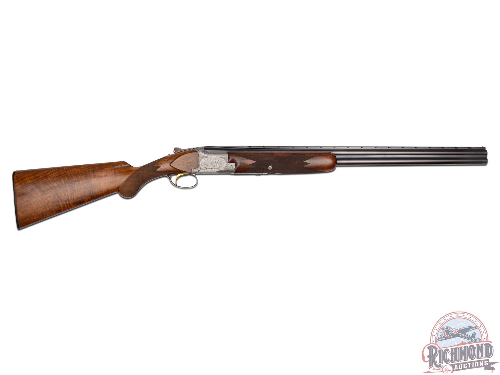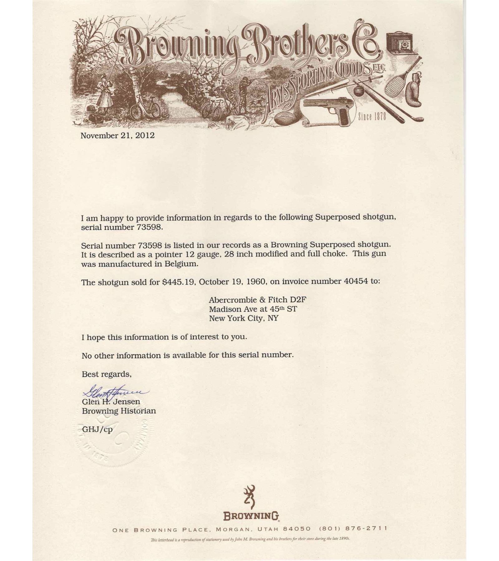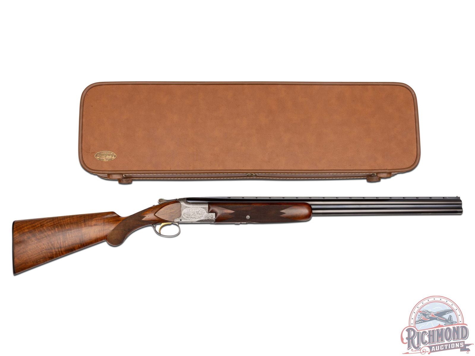 Made in Herstal, Belgium by Browning in 1960. Gun comes with Griffin and Howe Letter stating it was shipped to Abercrombie and Fitch on October 24, 1960 and sold to "Jas. H. Stamp" in 1961. Also comes with Browning Letter verifying all options and original price. This model was only built from 1960-1966. Fitted with 28" blued Special Steel barrels in 12 gauge with ventilated rib, ejectors, 2-3/4" chambers, Full and Modified chokes, with Browning St. Louis and Montreal address markings. Satin finish receiver with vignette background engraving and a pointer on right with pheasant in mouth and a setter scene on left with duck in mouth. Both panels signed "L. Vrancken". Bottom has vignette and quail scene. Design was originally designed by Felix Funken and executed by Louis Vrancken. Action has gold washed single selective trigger with top tang safety and barrel selector. Select checkered walnut long tang round knob pistol grip stock with "Browning" butt plate. Matching attached sporting forearm with latch release. Comes in Browning fitted luggage trunk case. LOP: 14-1/4". DAC: 1-5/8". DAH: 2-1/2". CALIBER: 12 GA. S/N: 73598. FFL STATUS: Curio & Relic.