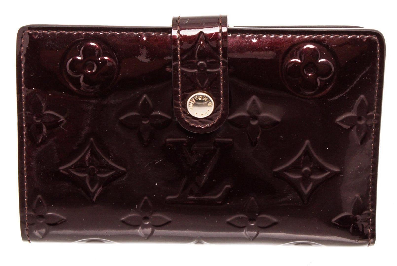 Amarante vernis leather Louis Vuitton French Purse wallet with brass hardware, exterior compartment with kiss-lock closure, Taiga leather lining, six card slots, single bill compartment and snap closure at front flap. Measurements: Length: 5 in / 13 cm Width: 0.75 in / 2 cm 3.5 in / 9 cmCONDITION: Pre-Owned Good overall, please see photographs for detail.