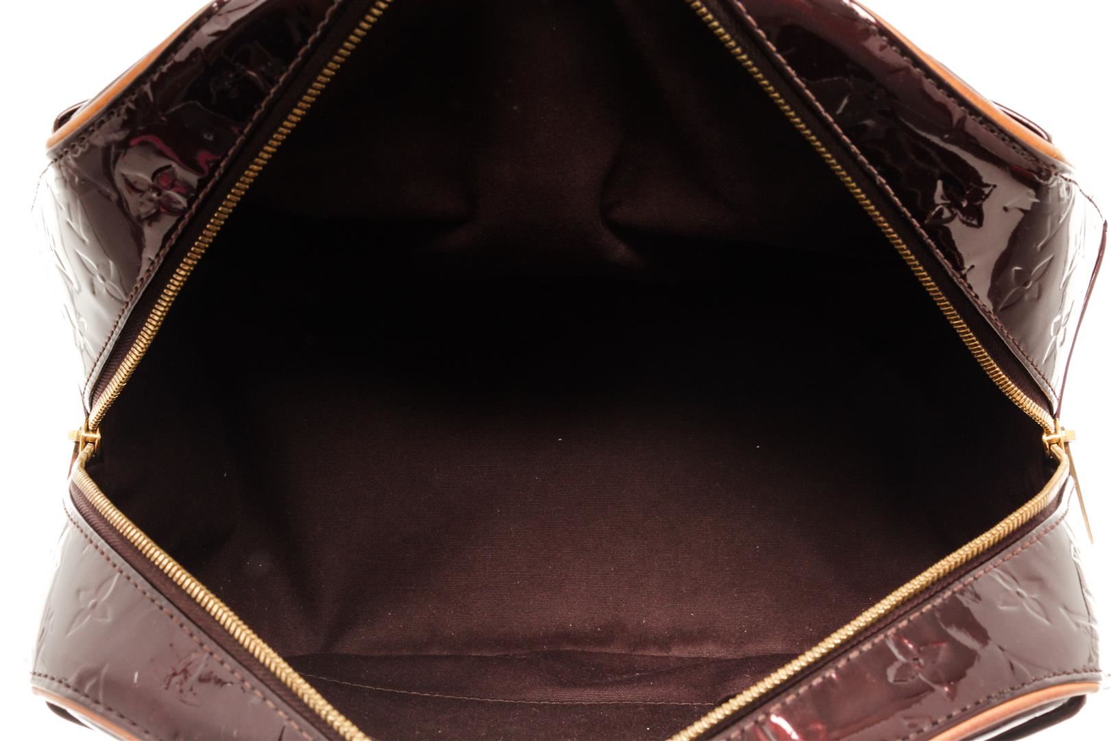 One Louis Vuitton Amarante Monogram Vernis Summit Drive Bag. Item is sold AS-IS. All available information is listed in the description and shown in the photo. louis vuitton amarante monogram vernis summit drive bag with gold-tone hardware, amarante monogram vernis patent leather dual rolled handles and exterior slip pockets, it is secured by a wide two-way zip closure that opens to a roomy fabric interior to hold all your essentials. Length: 12.59", Width: 5.51", Height: 9.44" / Length: 32 cm, Width: 14 cm, Height: 24 cm