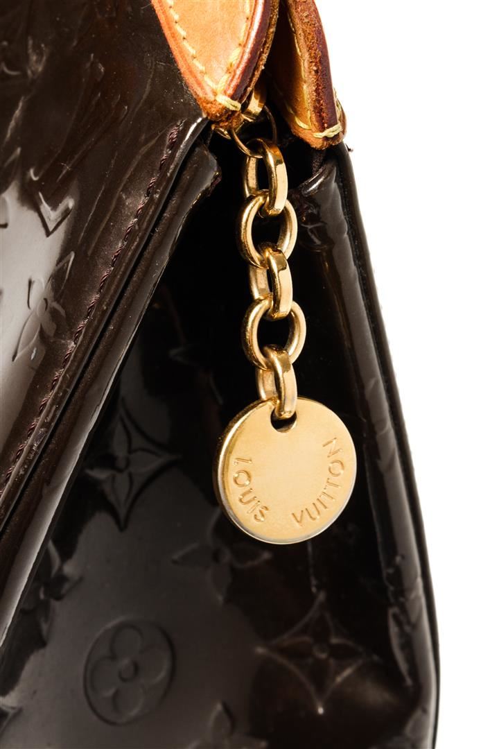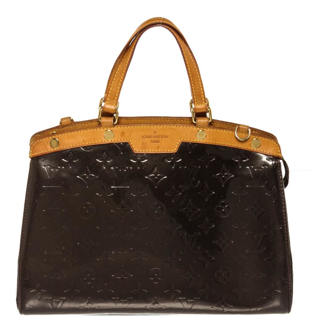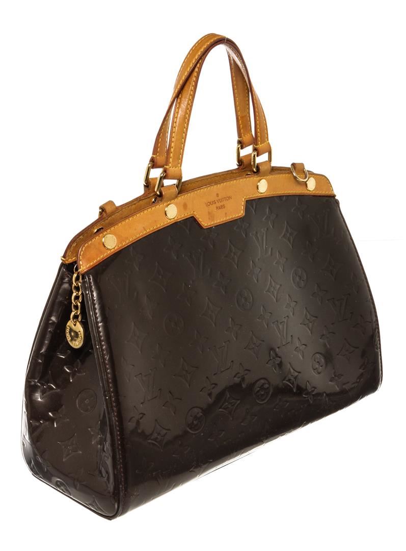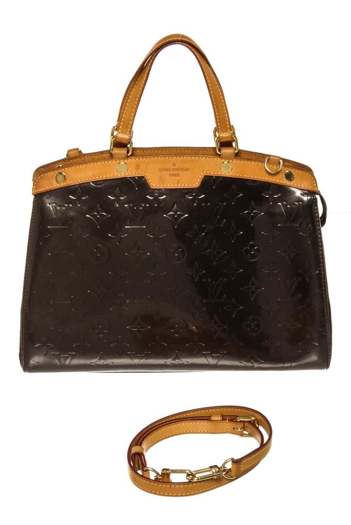 Louis Vuitton Amarante Purple Vernis Brea MM with Vachetta Leather trim, gold tone hardware, Canvas trim, One zip pocket, two flat pockets, detachable adjustable strap, and top zipper closure.