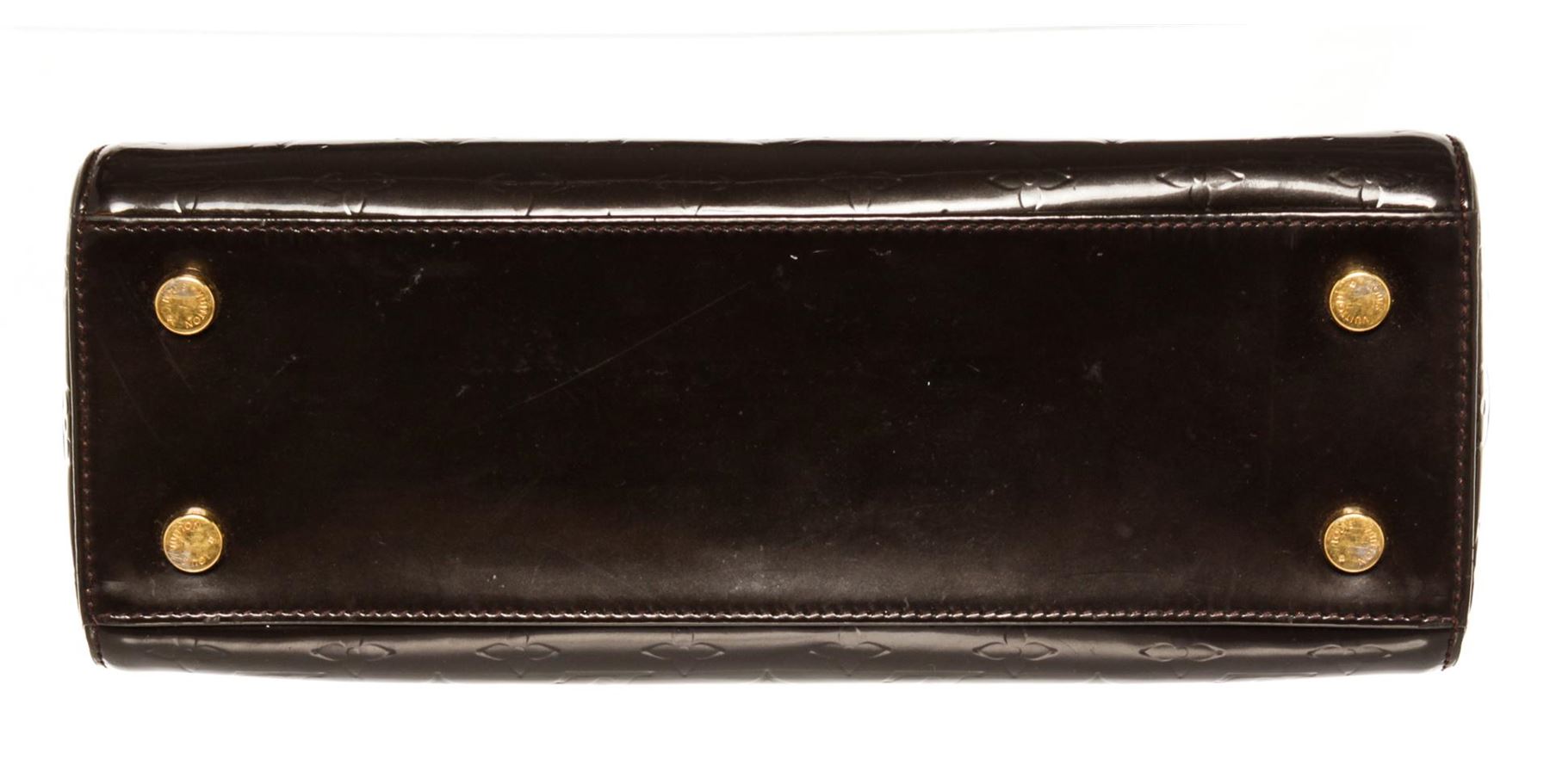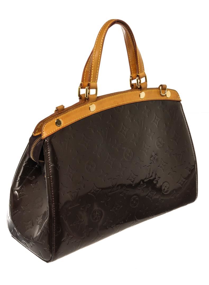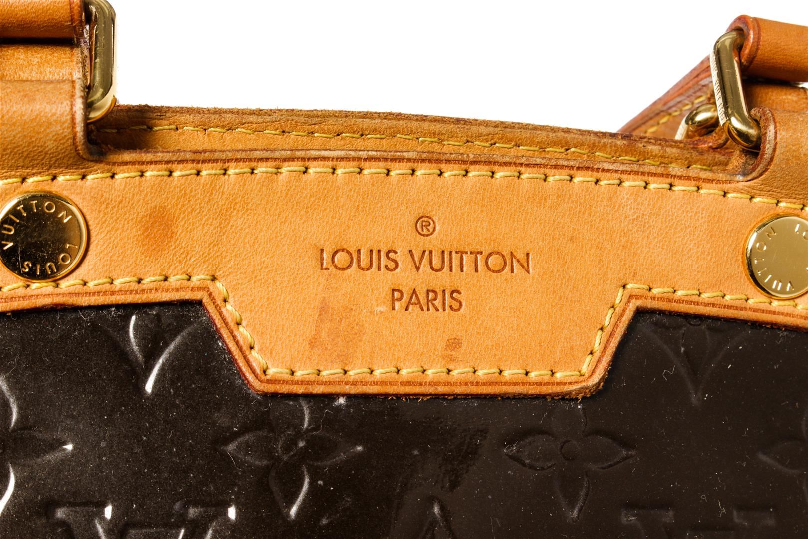 Louis Vuitton Amarante Purple Vernis Brea MM with Vachetta Leather trim, gold tone hardware, Canvas trim, One zip pocket, two flat pockets, detachable adjustable strap, and top zipper closure.