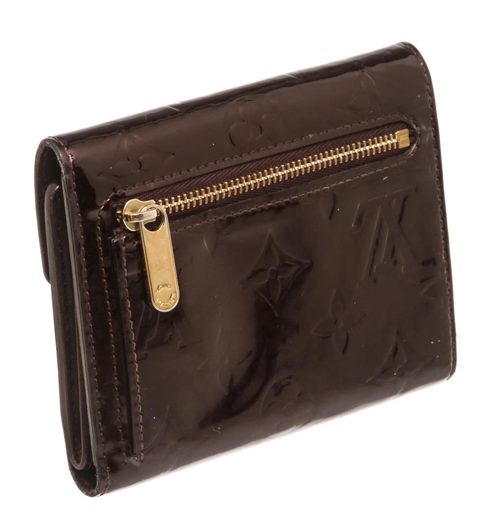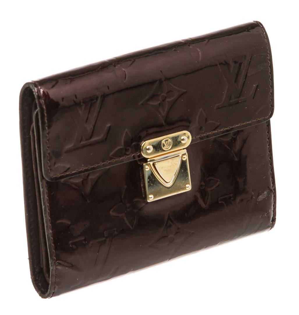Amarante Vernis leather Louis Vuitton Koala wallet with brass hardware, single exterior zip coin compartment, tonal leather interior, single interior bill compartment, 10 interior card slots and push-lock closure at front flap.