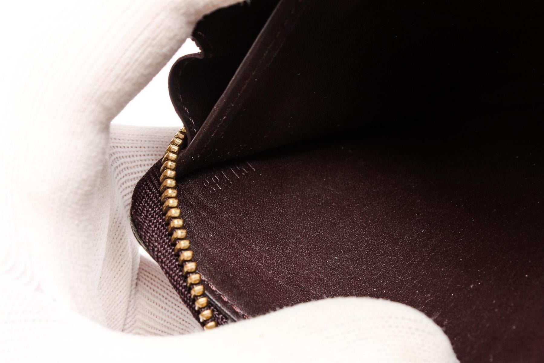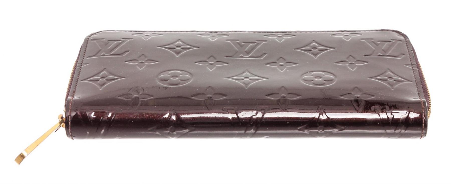 Amarante Monogram Vernis leather Louis Vuitton Zippy wallet with brass hardware, tonal leather lining, four interior compartments; one with zip closure, three bill compartments, eight card slots and zip-around closure.