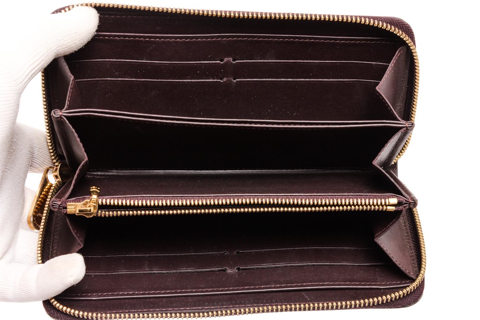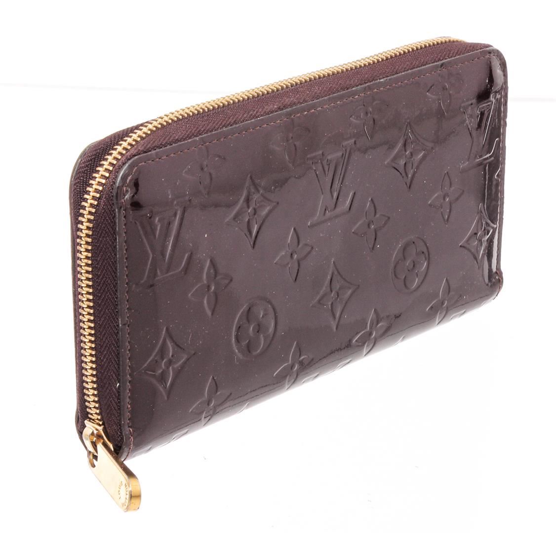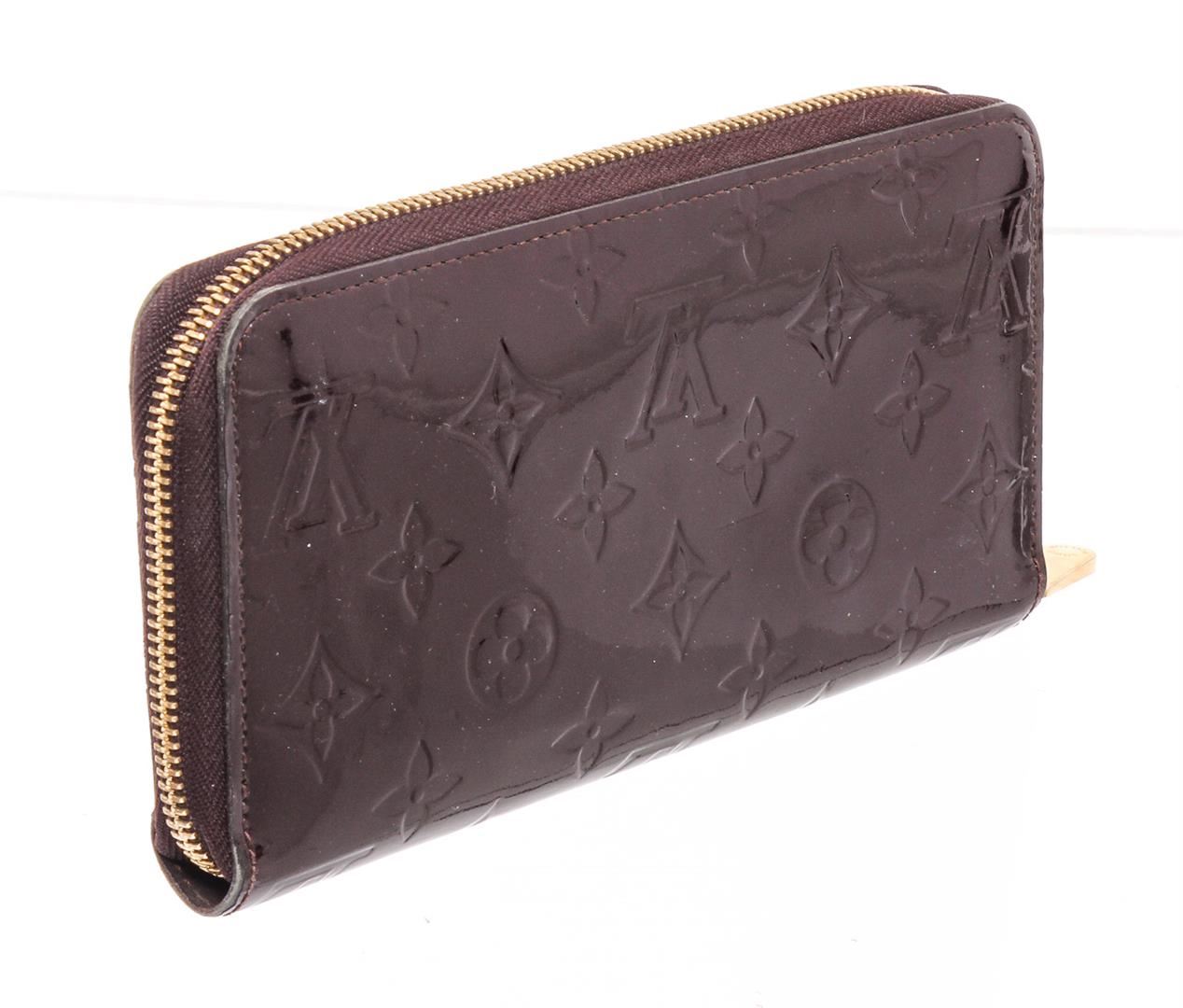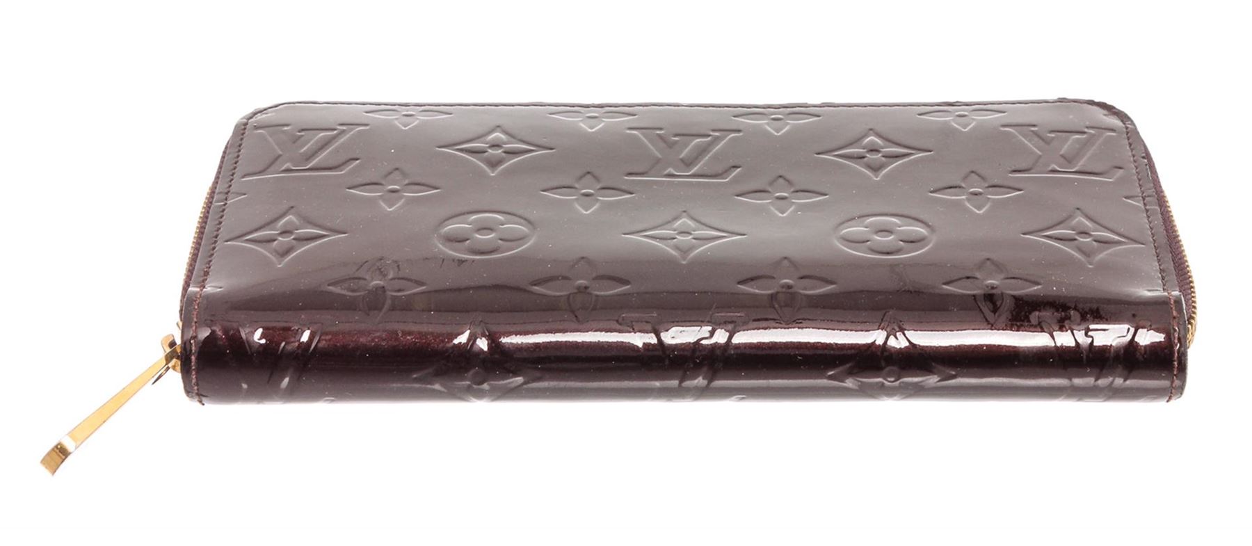 Amarante Monogram Vernis leather Louis Vuitton Zippy wallet with brass hardware, tonal leather lining, four interior compartments; one with zip closure, three bill compartments, eight card slots and zip-around closure.