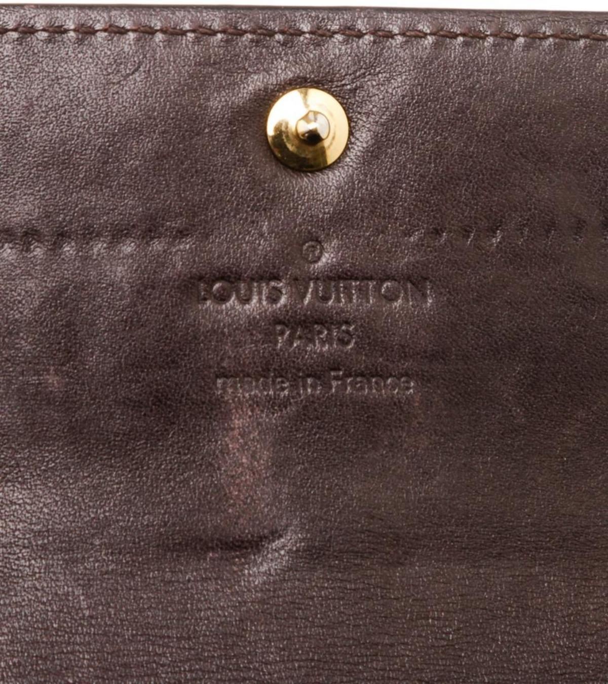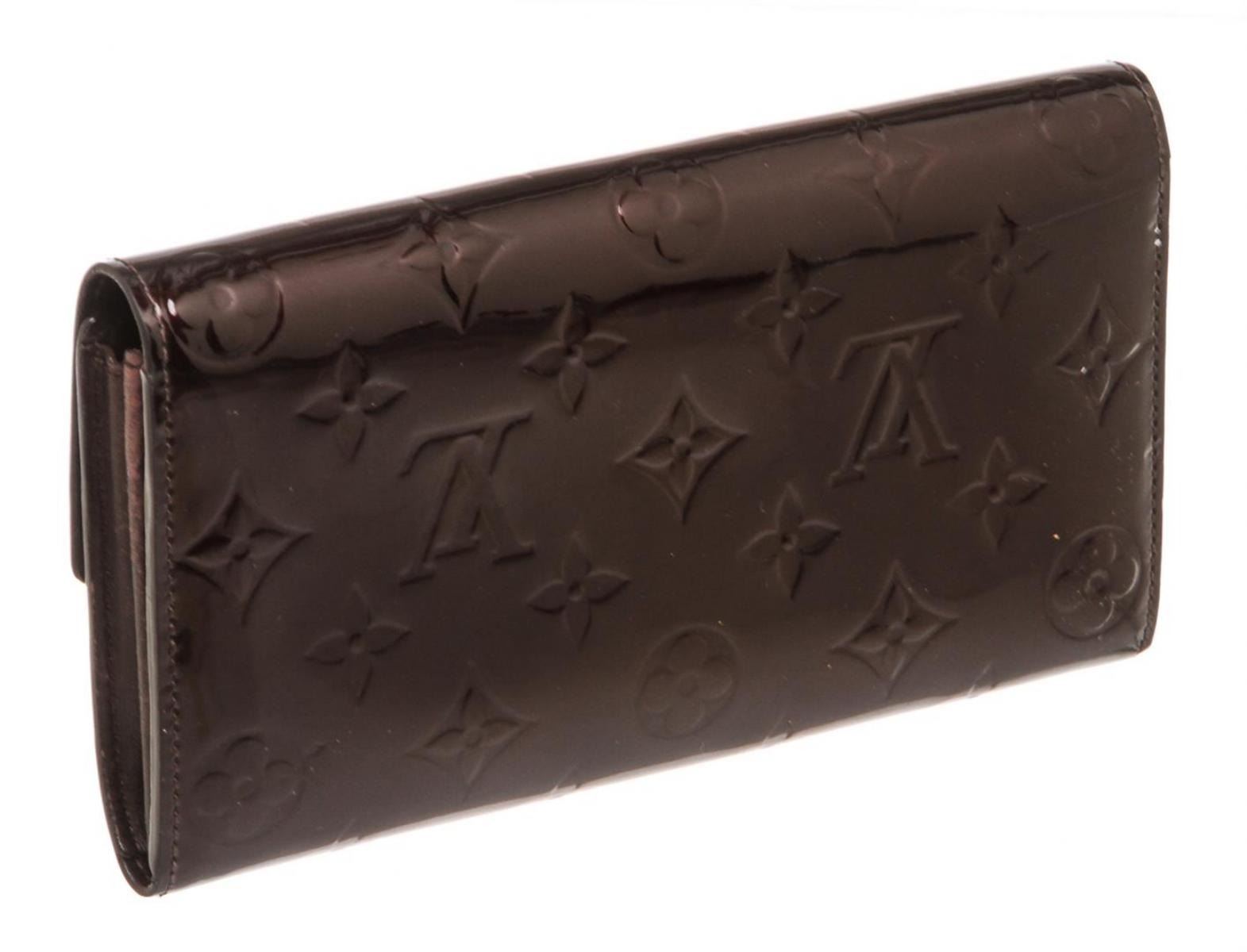 One Louis Vuitton Amarante Vernis Monogram Sarah Wallet. Amarante Monogram Vernis leather Louis Vuitton Sarah wallet with brass hardware, dual slip pockets at flap underside, tonal leather lining, dual interior pockets; one with zip closure, six card slots at interior wall and snap closure at front flap.
