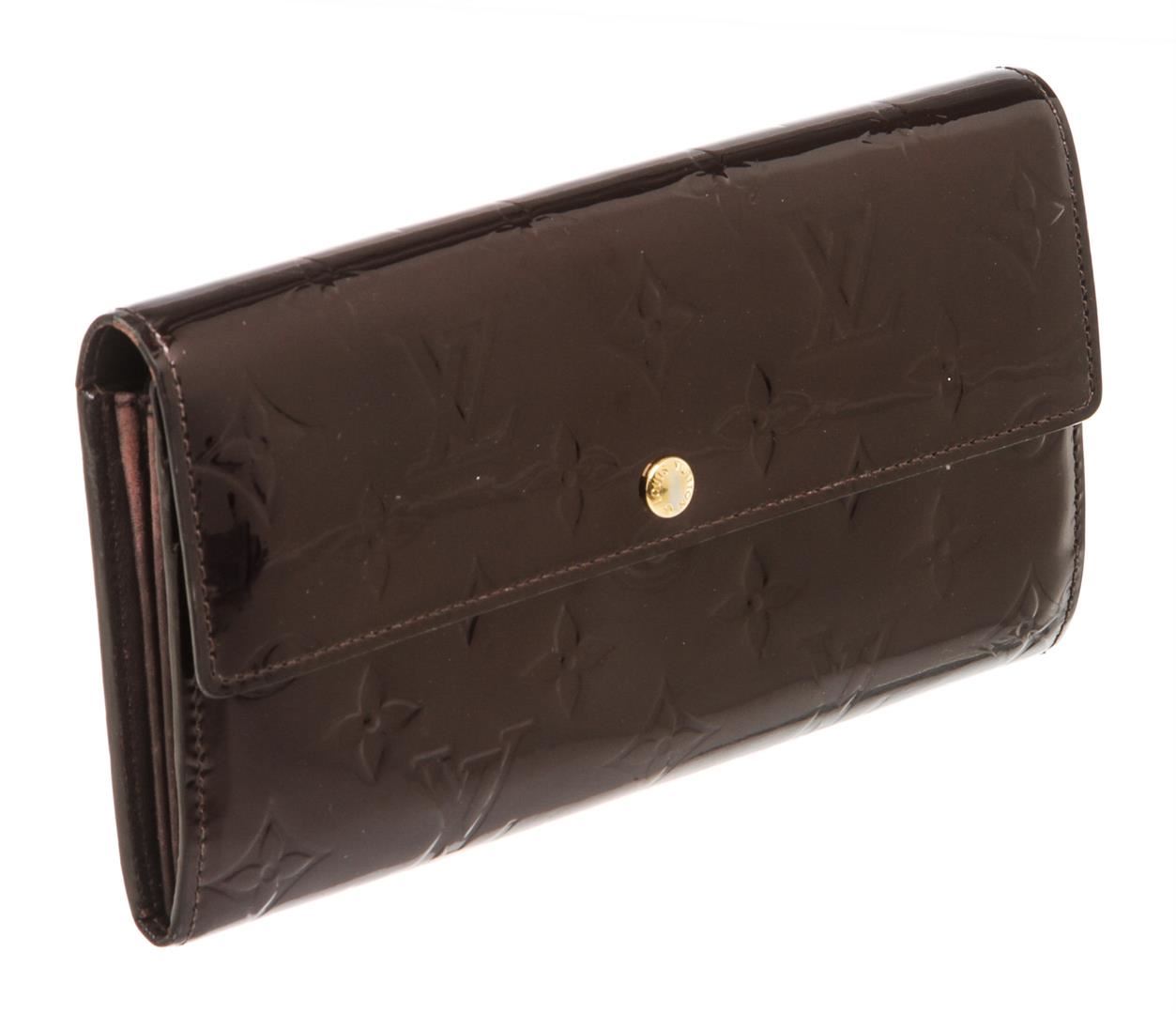 One Louis Vuitton Amarante Vernis Monogram Sarah Wallet. Amarante Monogram Vernis leather Louis Vuitton Sarah wallet with brass hardware, dual slip pockets at flap underside, tonal leather lining, dual interior pockets; one with zip closure, six card slots at interior wall and snap closure at front flap.
