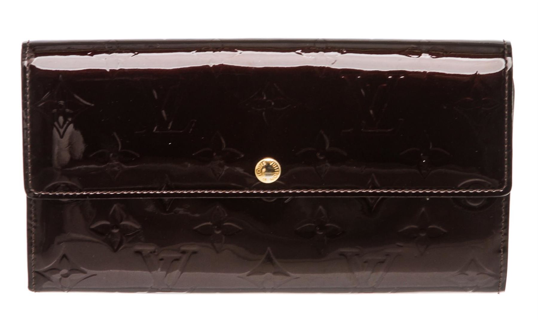 One Louis Vuitton Amarante Vernis Monogram Sarah Wallet. Amarante Monogram Vernis leather Louis Vuitton Sarah wallet with brass hardware, dual slip pockets at flap underside, tonal leather lining, dual interior pockets; one with zip closure, six card slots at interior wall and snap closure at front flap.