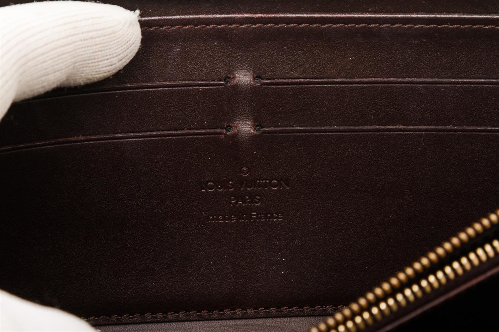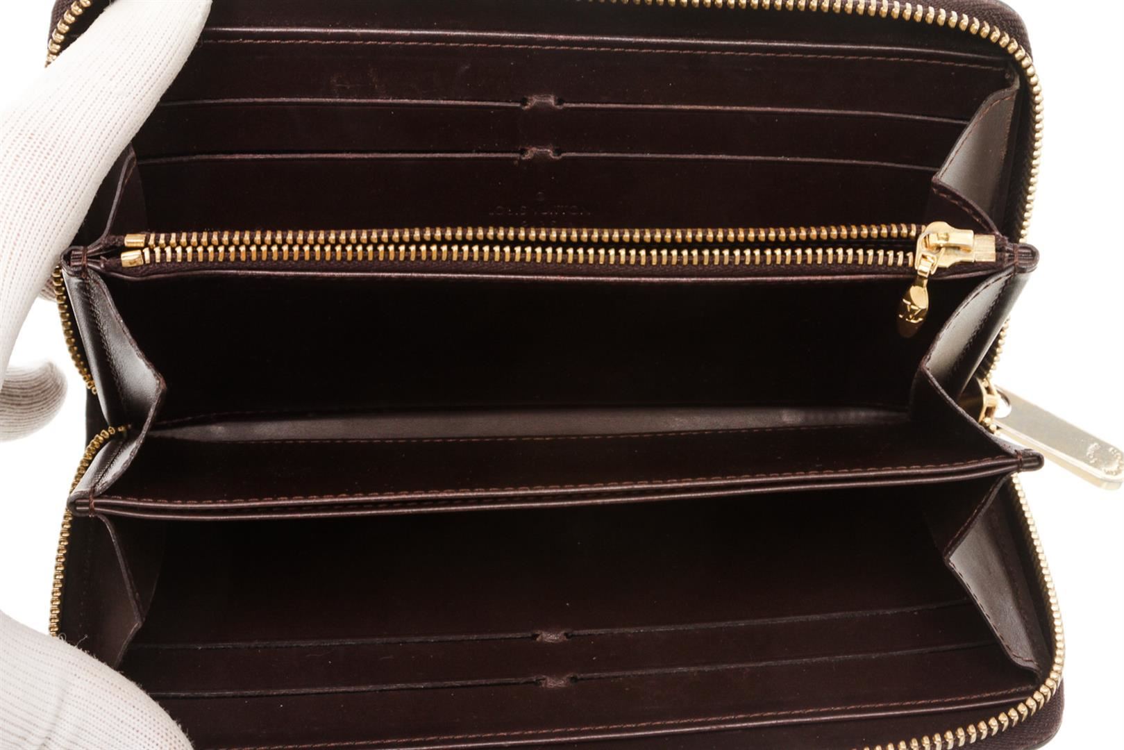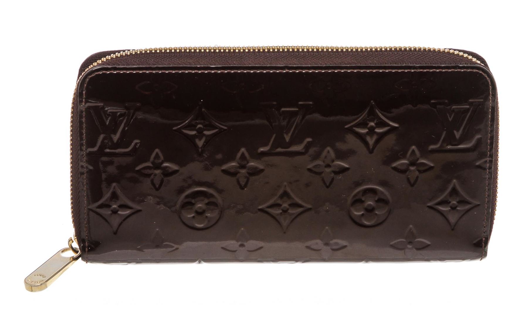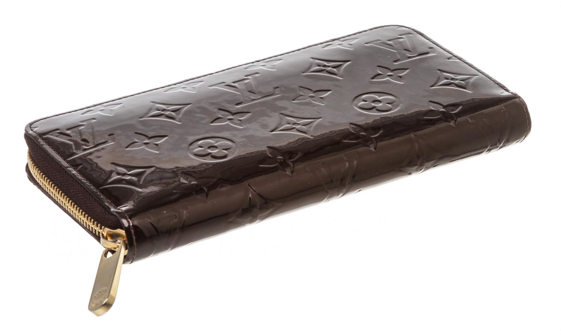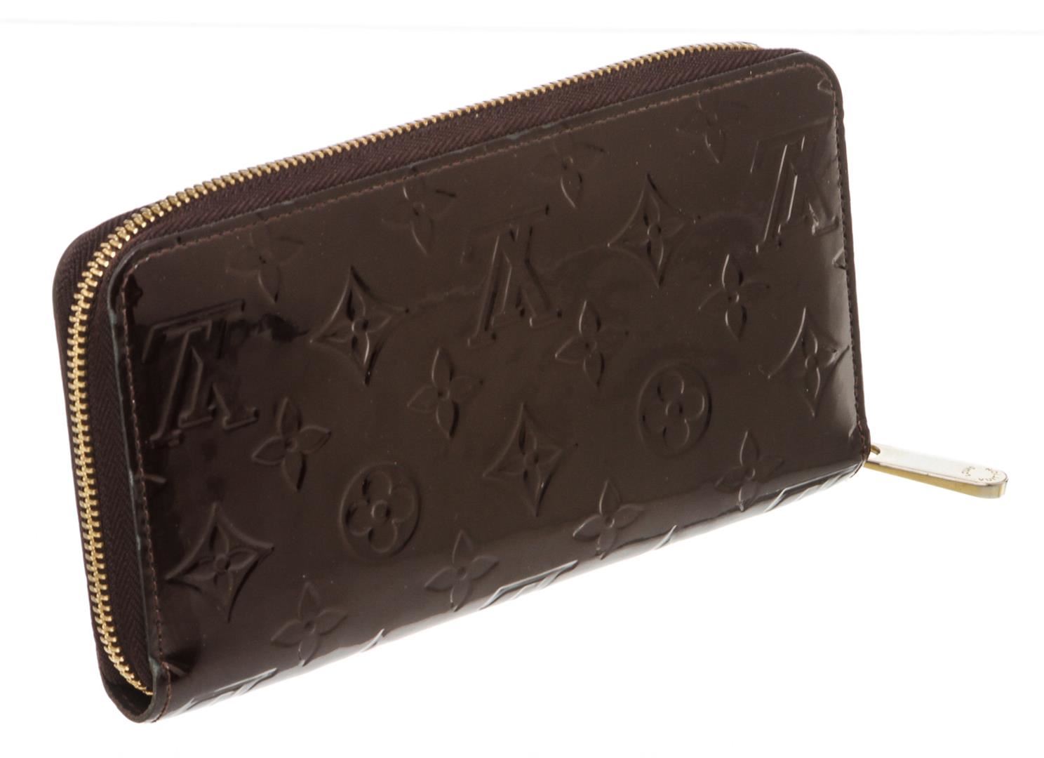 One Louis Vuitton Amarante Vernis Monogram Zippy Wallet. Monogram Vernis leather Louis Vuitton Zippy wallet with brass hardware, tonal leather lining, four interior compartments; one with zip closure, three bill compartments, eight card slots and zip-around closure.