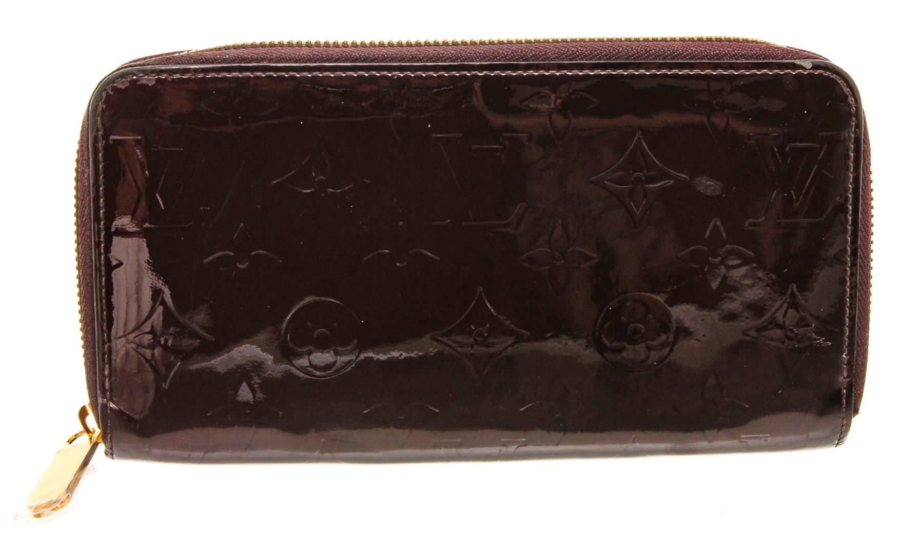 One Louis Vuitton Amarante Vernis Monogram Zippy Wallet. Amarante Monogram Vernis leather Louis Vuitton Zippy wallet with brass hardware, tonal leather lining, four interior compartments; one with zip closure, three bill compartments, eight card slots and zip-around closure.
