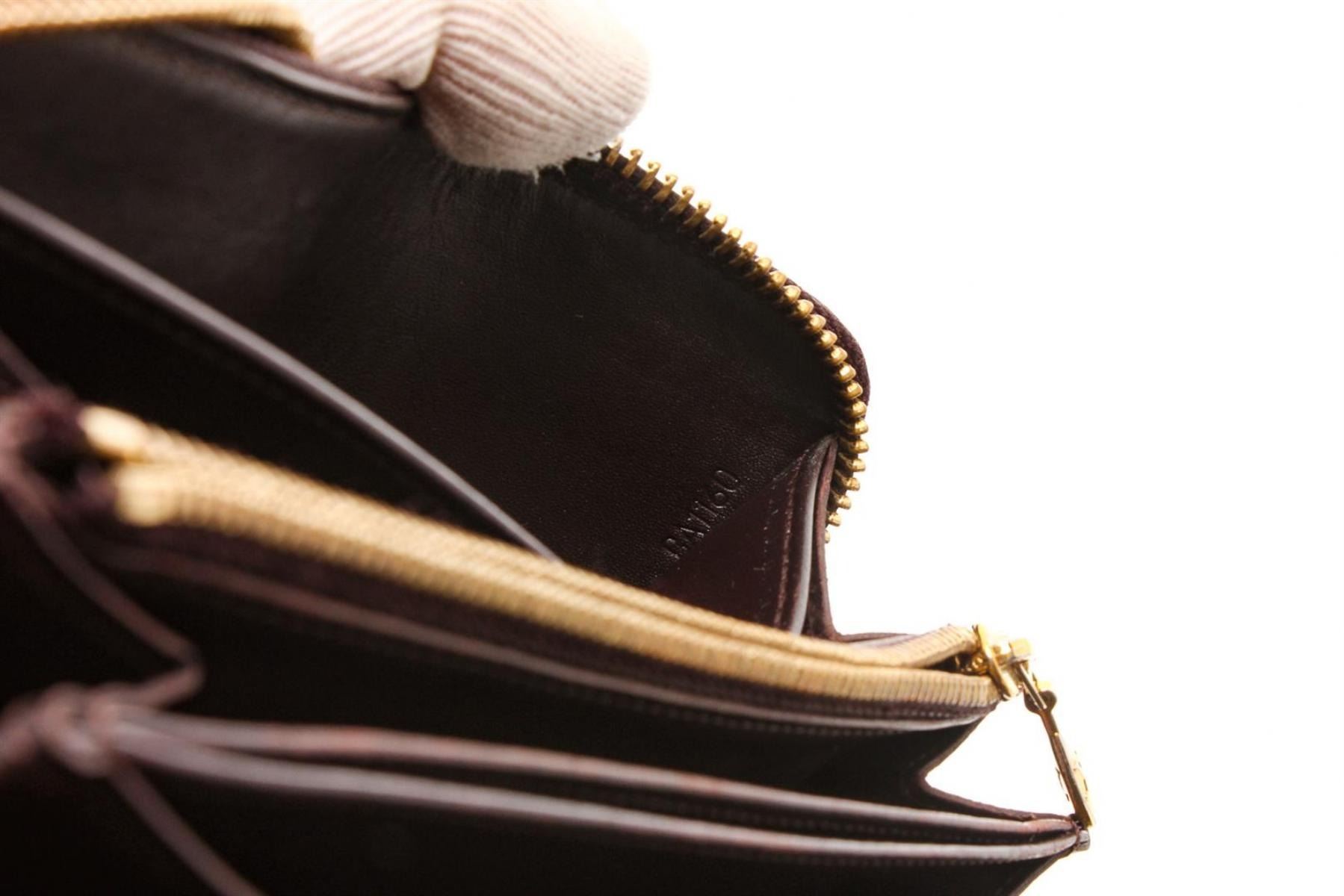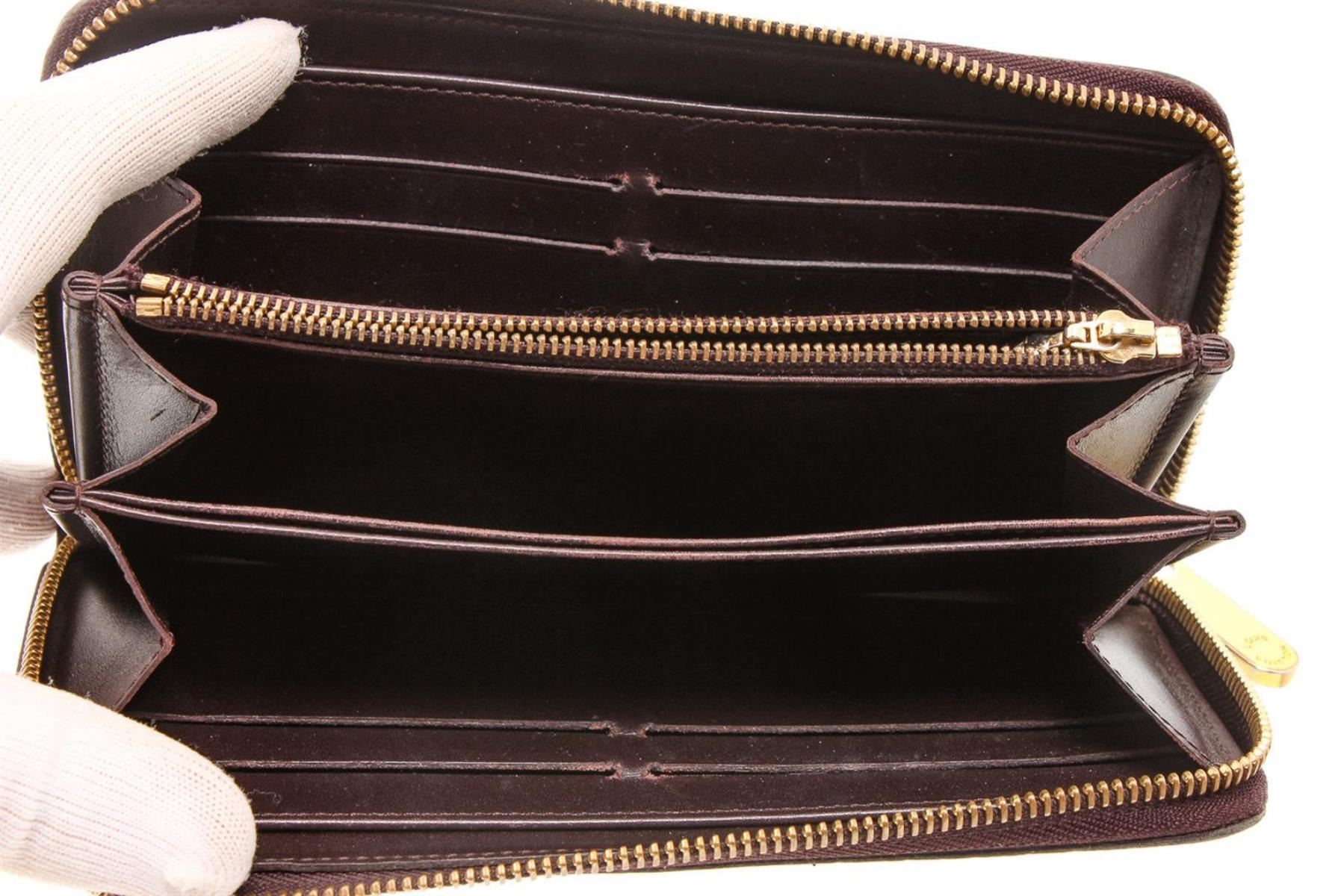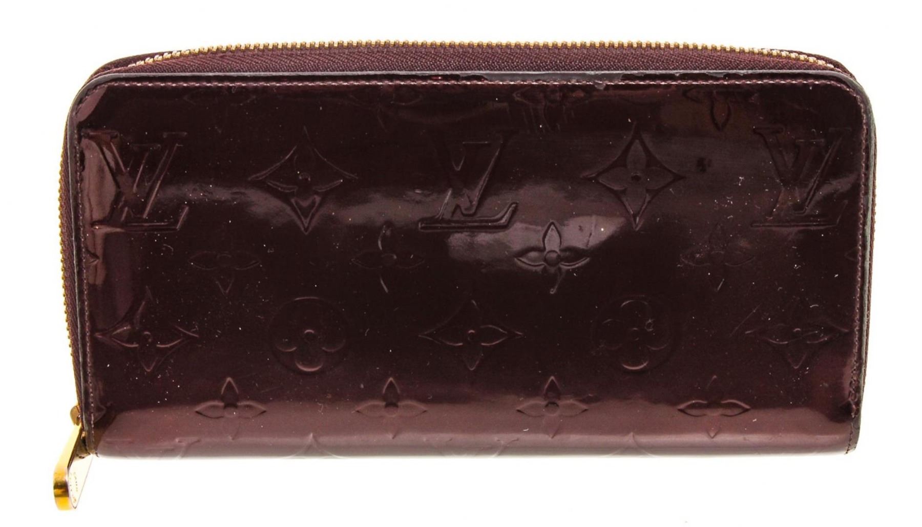 One Louis Vuitton Amarante Vernis Monogram Zippy Wallet. Amarante Monogram Vernis leather Louis Vuitton Zippy wallet with brass hardware, tonal leather lining, four interior compartments; one with zip closure, three bill compartments, eight card slots and zip-around closure.