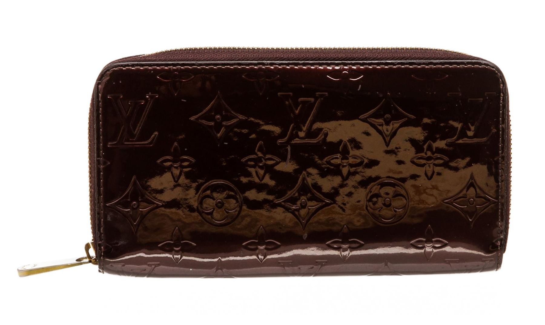 One Louis Vuitton Amarante Vernis Monogram Zippy Wallet. Monogram Vernis leather Louis Vuitton Zippy wallet with brass hardware, tonal leather lining, four interior compartments; one with zip closure, three bill compartments, eight card slots and zip-around closure.