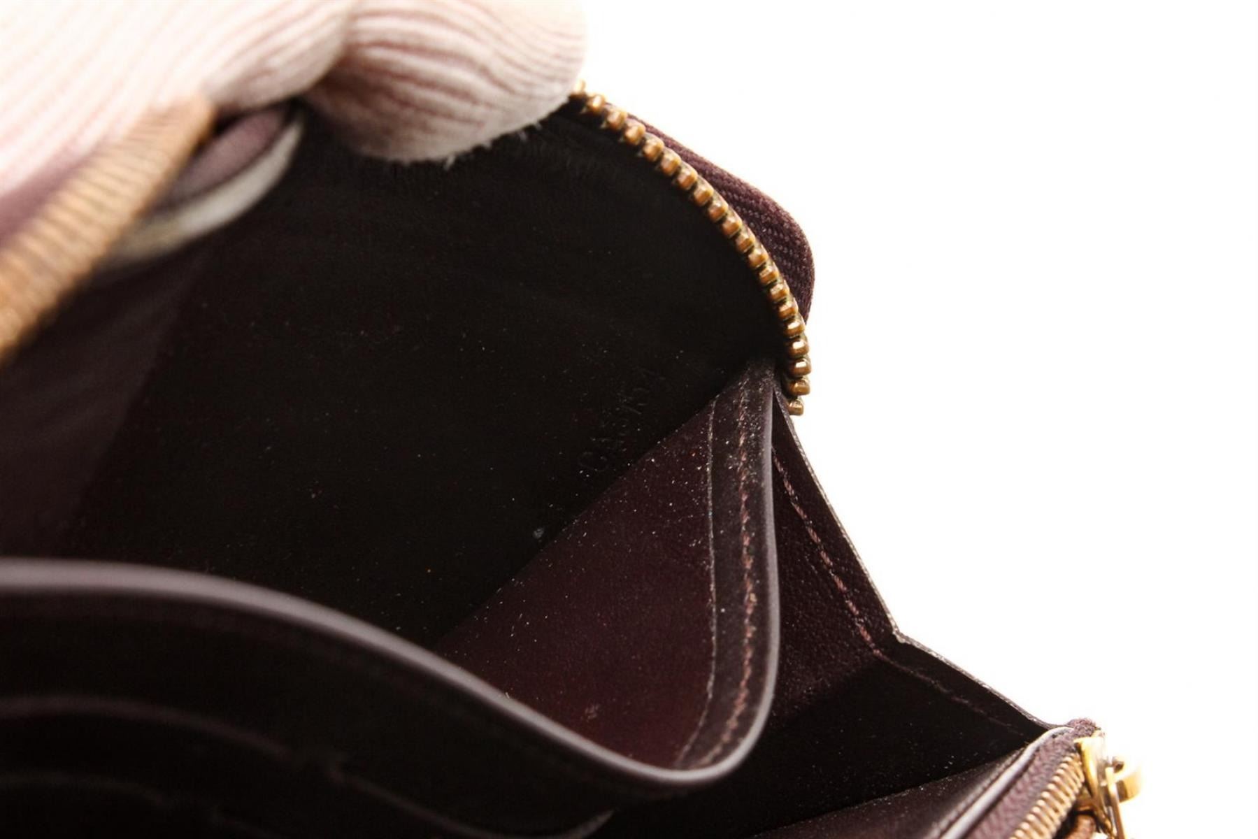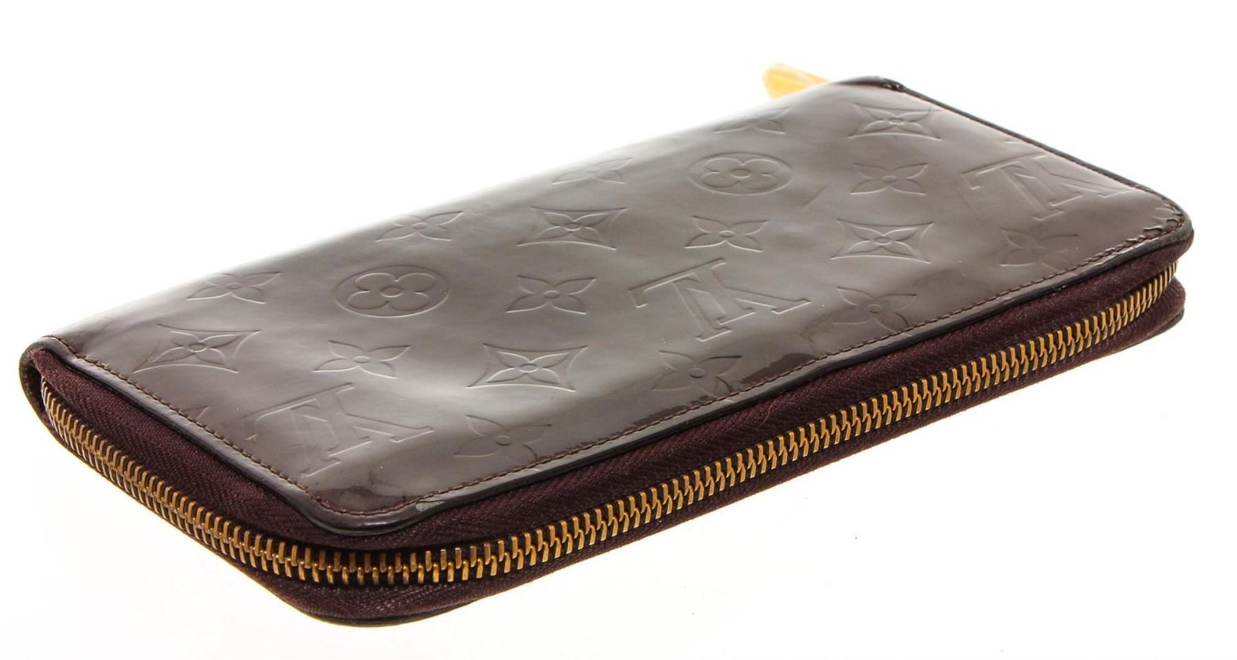 One Louis Vuitton Amarante Vernis Monogram Zippy Wallet. Amarante Monogram Vernis leather Louis Vuitton Zippy wallet with brass hardware, tonal leather lining, four interior compartments; one with zip closure, three bill compartments, eight card slots and zip-around closure.