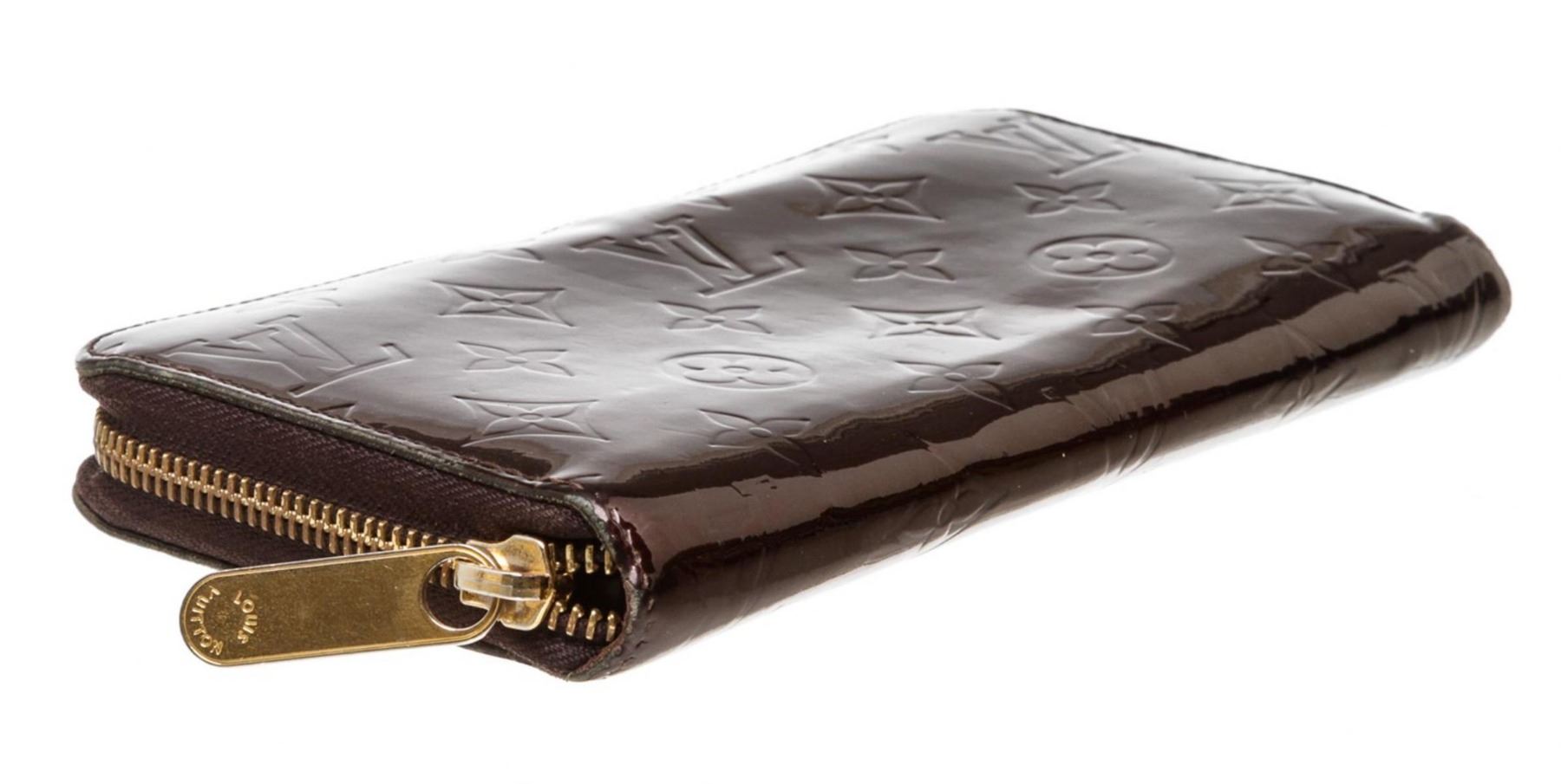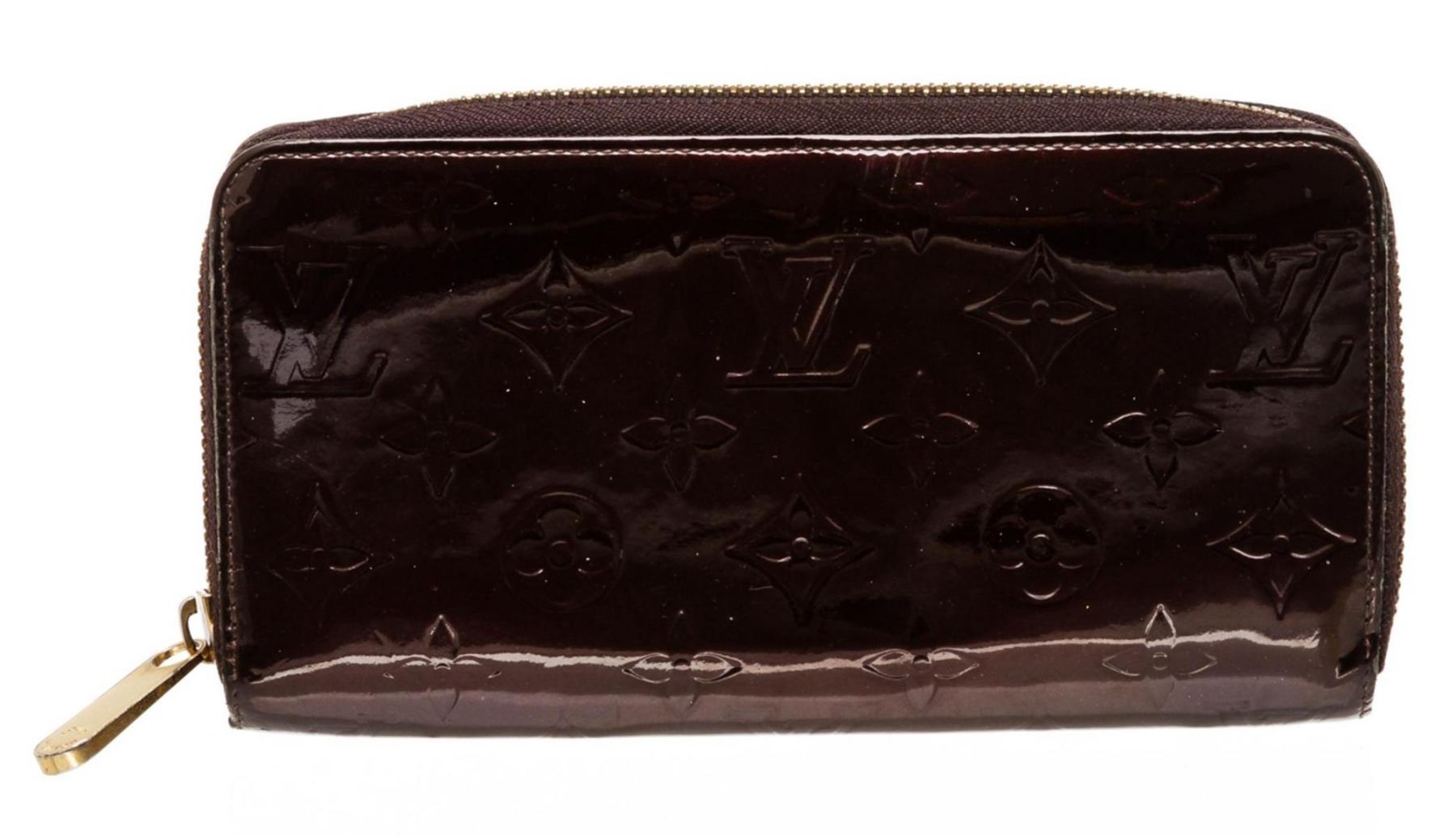 One Louis Vuitton Amarante Vernis Monogram Zippy Wallet. Monogram Vernis leather Louis Vuitton Zippy wallet with brass hardware, tonal leather lining, four interior compartments; one with zip closure, three bill compartments, eight card slots and zip-around closure.