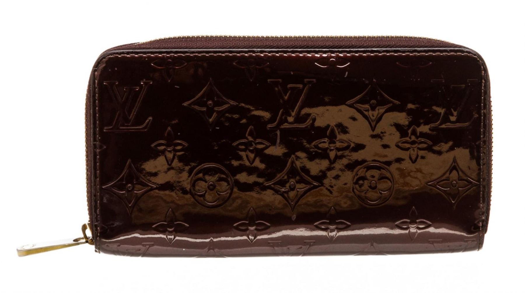 One Louis Vuitton Amarante Vernis Monogram Zippy Wallet. Monogram Vernis leather Louis Vuitton Zippy wallet with brass hardware, tonal leather lining, four interior compartments; one with zip closure, three bill compartments, eight card slots and zip-around closure.