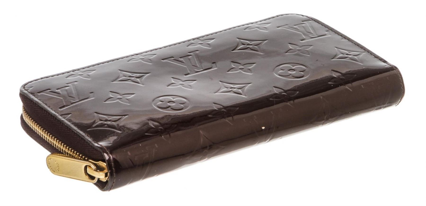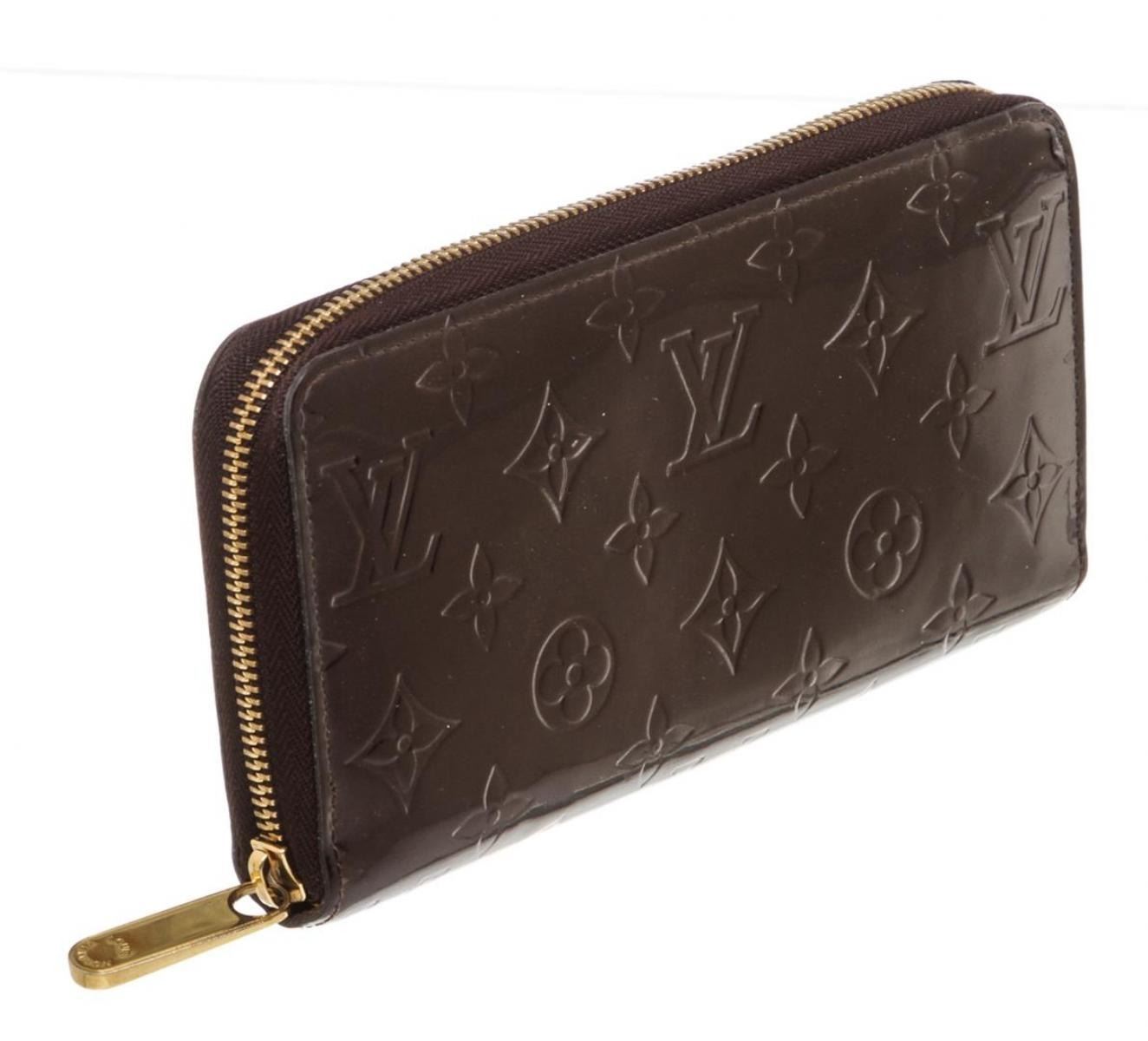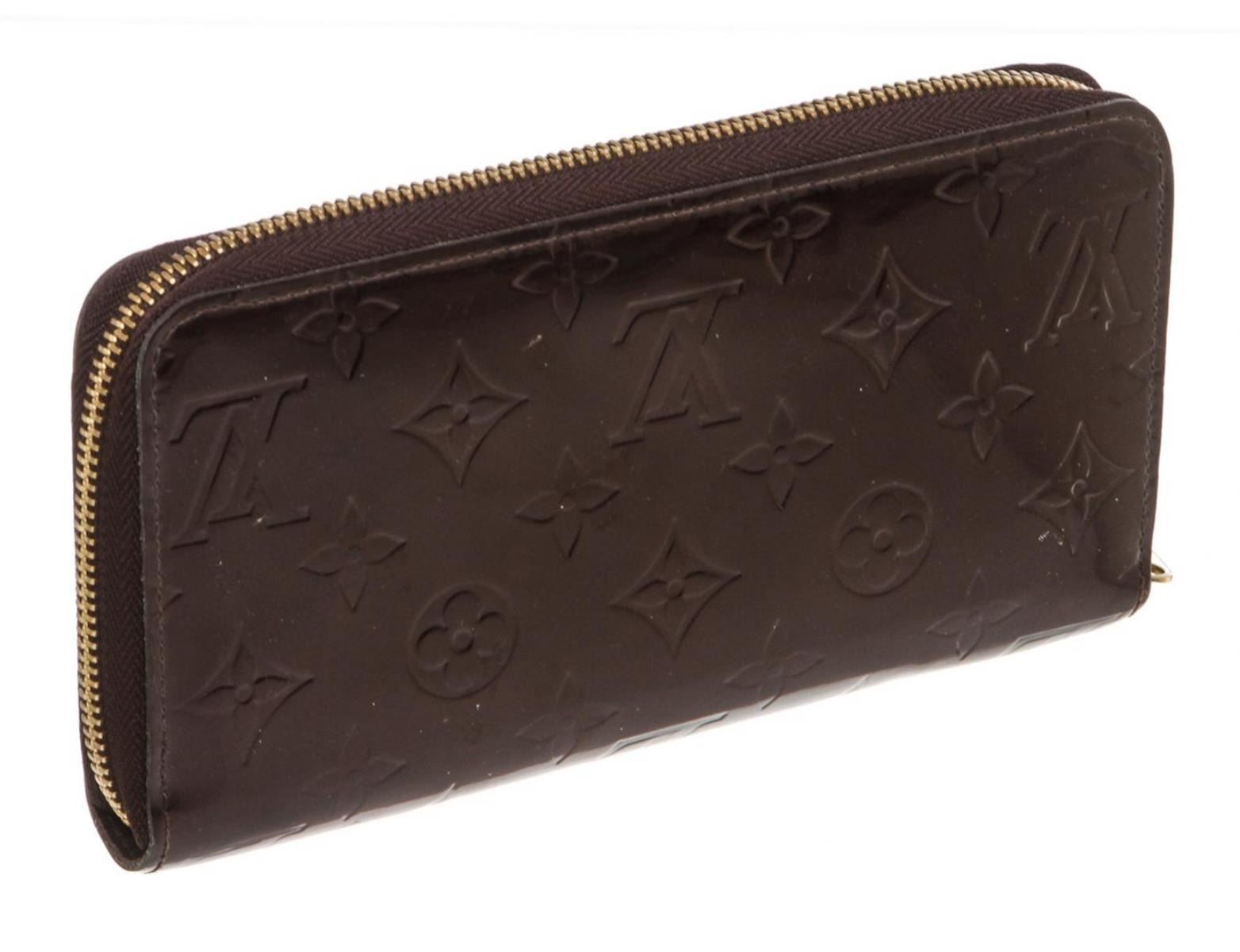 Amarante Monogram Vernis leather Louis Vuitton Zippy wallet with brass hardware, tonal leather lining, four interior compartments; one with zip closure, three bill compartments, eight card slots and zip-around closure.