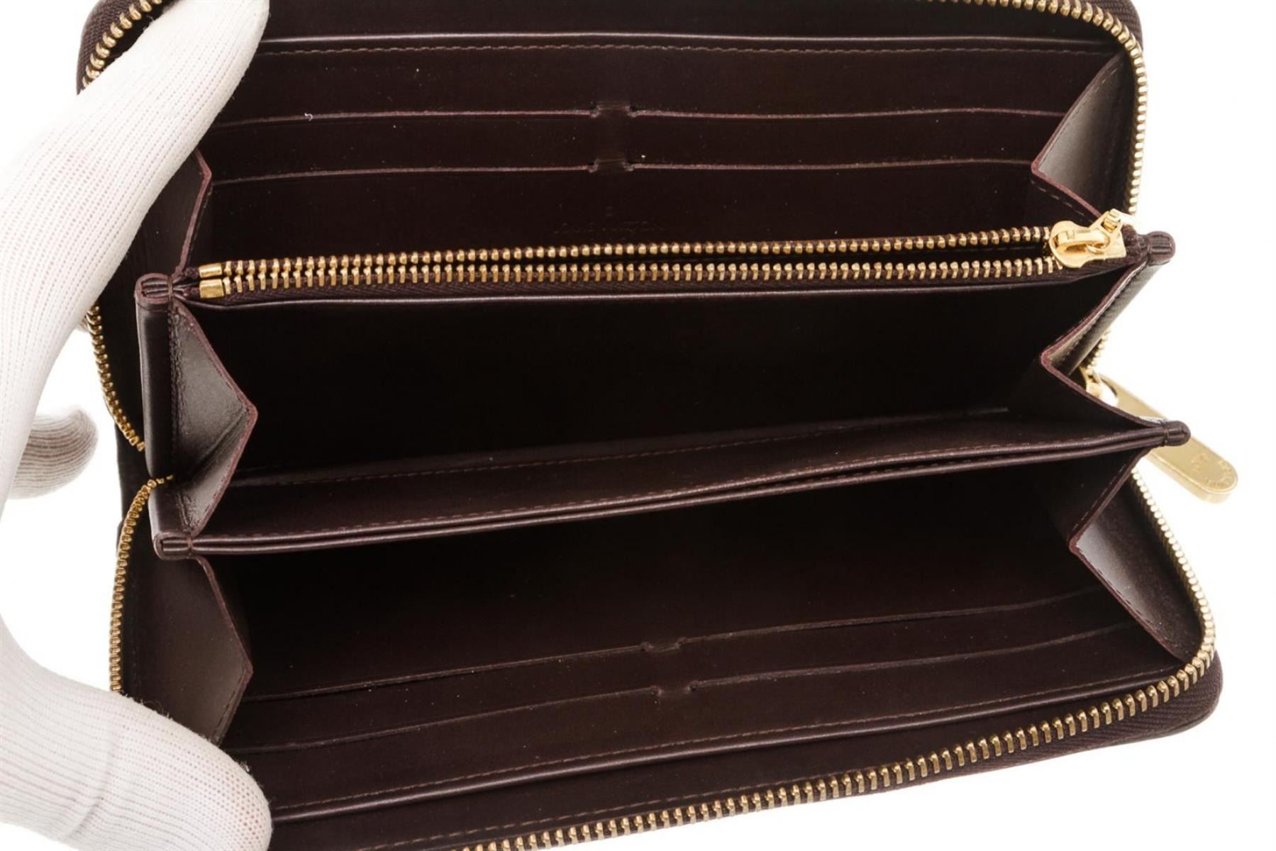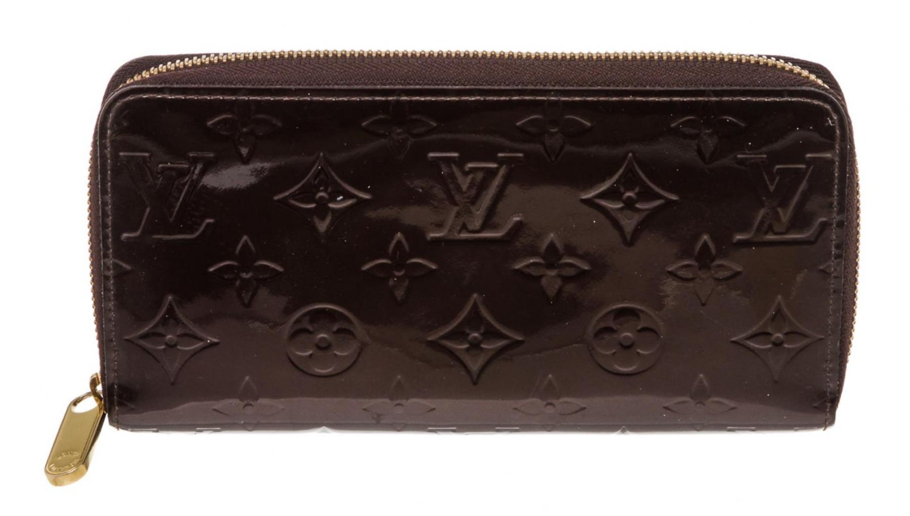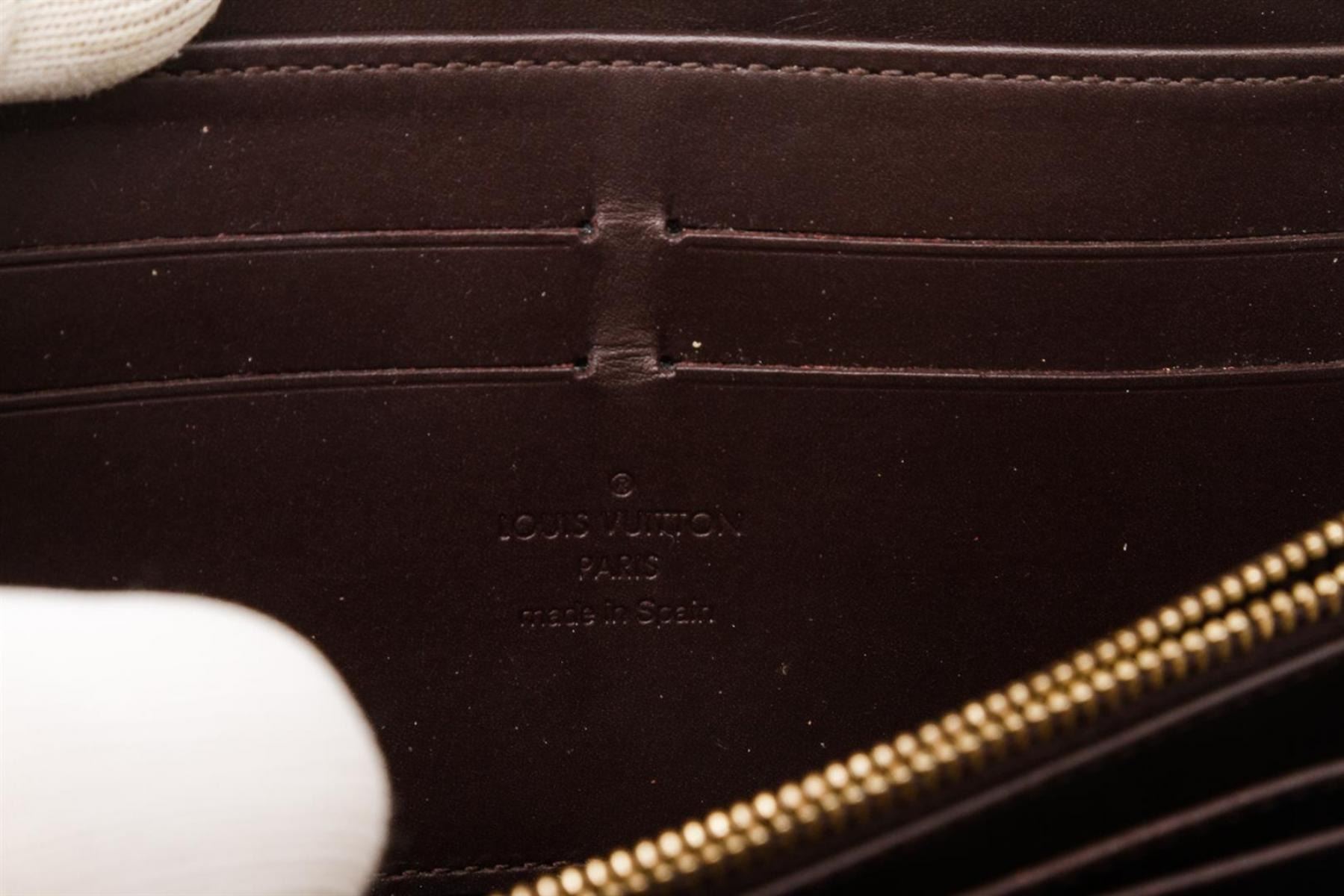 Amarante Monogram Vernis leather Louis Vuitton Zippy wallet with brass hardware, tonal leather lining, four interior compartments; one with zip closure, three bill compartments, eight card slots and zip-around closure.
