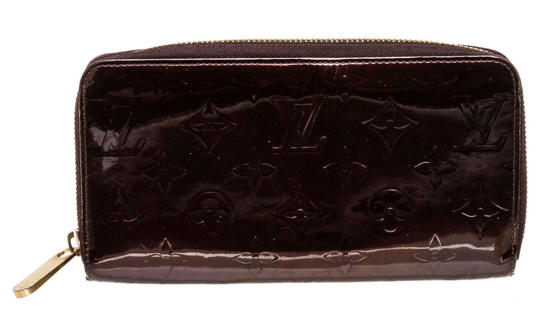 One Louis Vuitton Amarante Vernis Monogram Zippy Wallet. Monogram Vernis leather Louis Vuitton Zippy wallet with brass hardware, tonal leather lining, four interior compartments; one with zip closure, three bill compartments, eight card slots and zip-around closure.