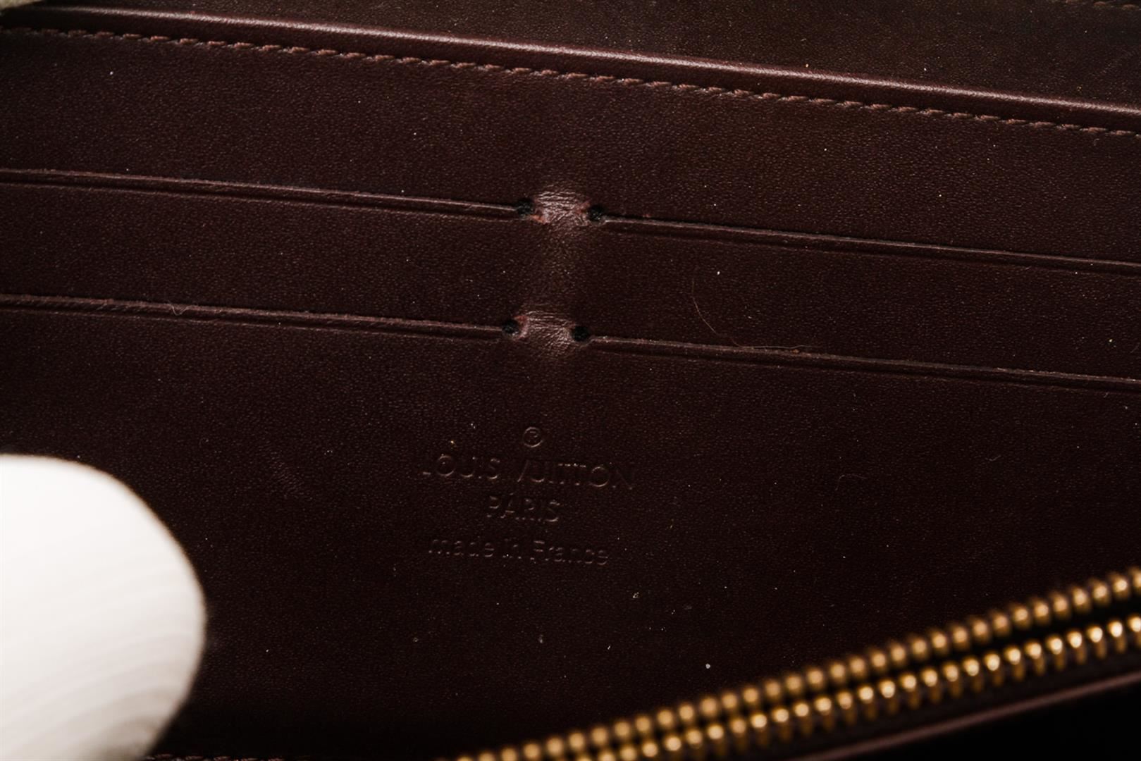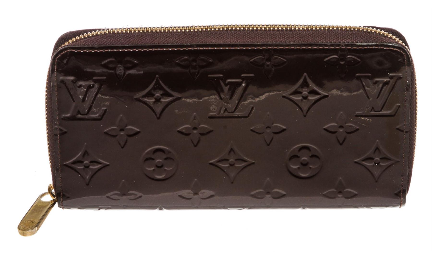 Amarante Monogram Vernis leather Louis Vuitton Zippy wallet with brass hardware, tonal leather lining, four interior compartments; one with zip closure, three bill compartments, eight card slots and zip-around closure.